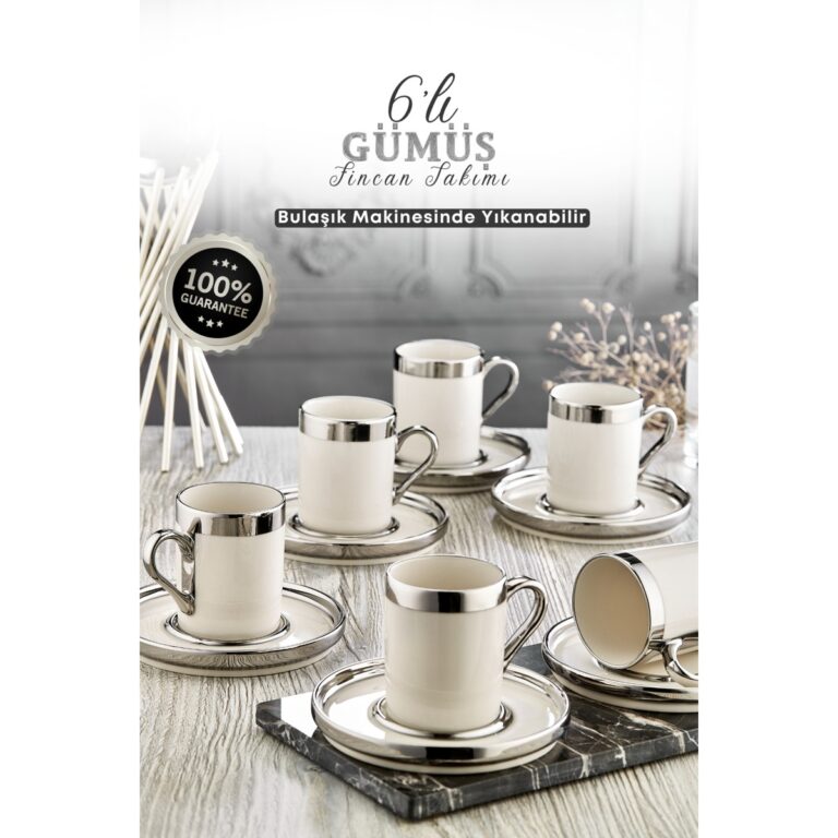 Grimor Life Gümüş Yaldızlı 6 Kişilik Porselen Fincan Seti 12 Parça Türk Kahvesi Takımı Kahve Fincanı 100 ml