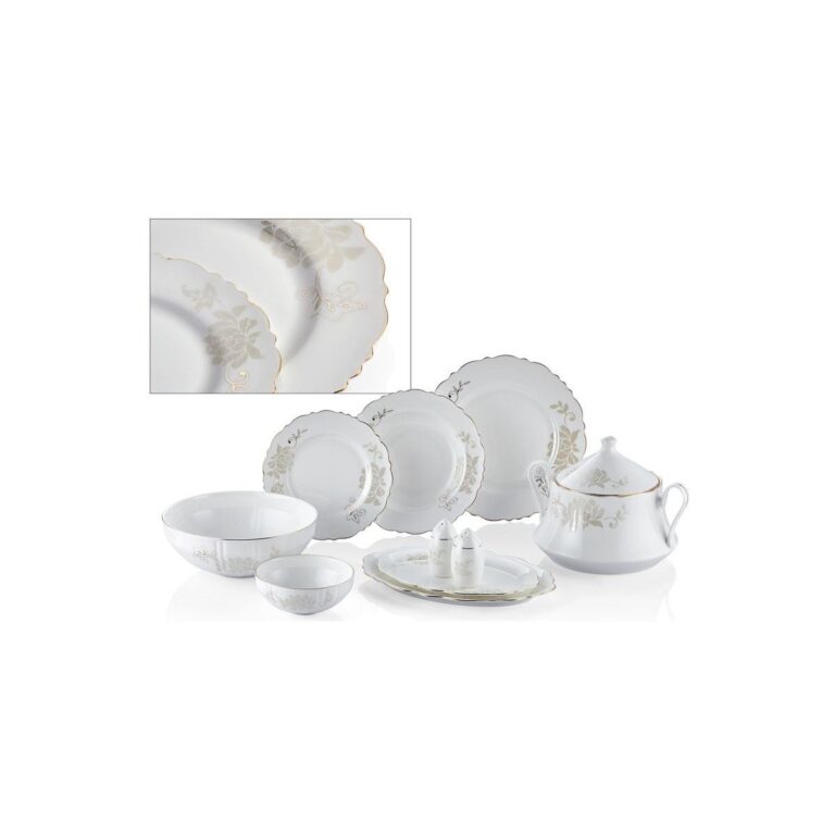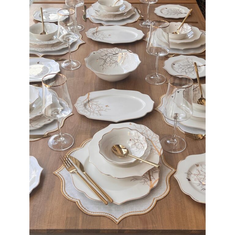 Karaca Stream Bone Geo 59 Parça 12 Kişilik New Bone Yemek Takımı – Beyaz, Altın Detaylı Modern Geometrik Tasarım