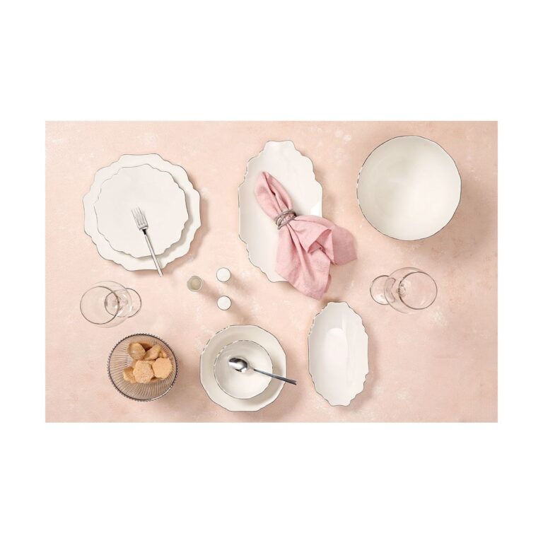 Karaca Stream Bone Geo 59 Parça 12 Kişilik New Bone Yemek Takımı – Beyaz, Altın Detaylı Modern Geometrik Tasarım