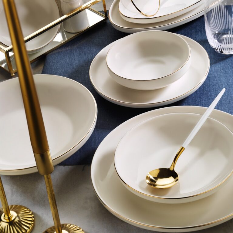 Porland Almina 18 Parça 6 Kişilik Beyaz Porselen Yemek ve Sunum Takımı – Altın File Detaylı Zarif Tasarım