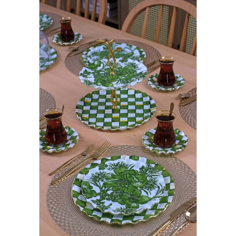 Akdeniz Home Glore Mode Green Altın Yaldızlı 34 Parça 6 Kişilik Cam Pasta Servis Takımı | Lüks Altın Detaylı Set