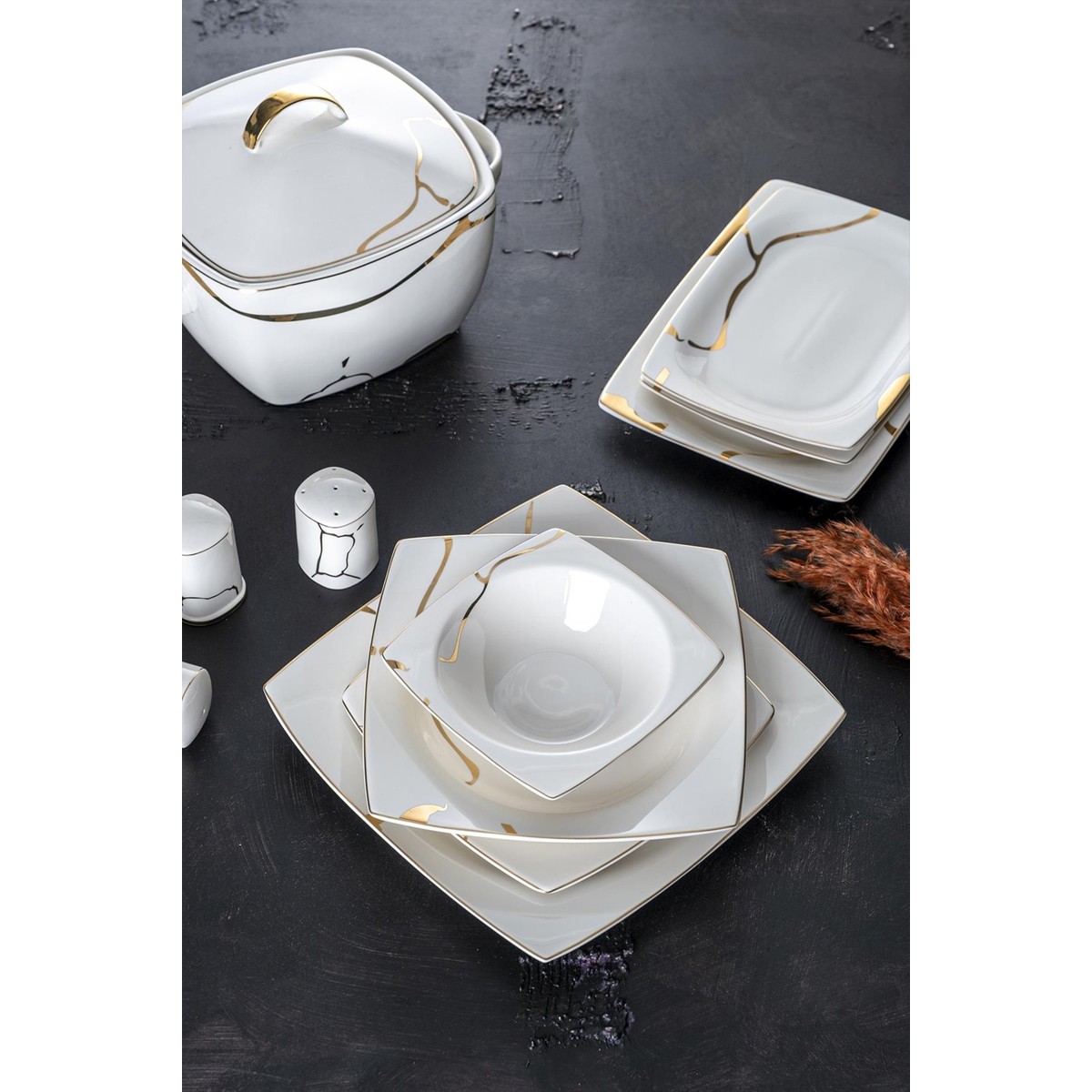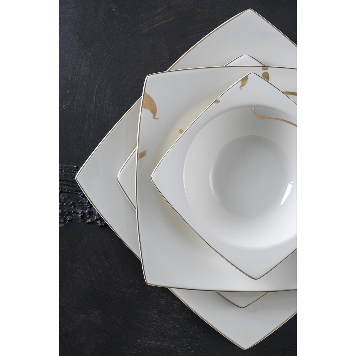 Kare formuna sahip, uzun ömürlü kullanılabilen gold çizgileri ve modern tasarım hatları ile sofralarınıza farklı bir soluk getirecek Henna 60 Parça Yemek Takımı…