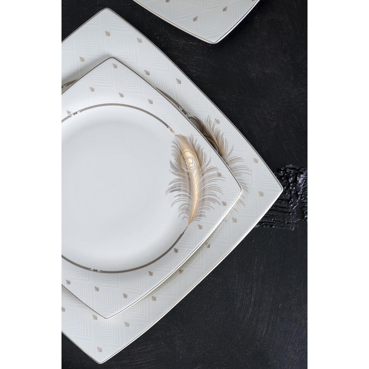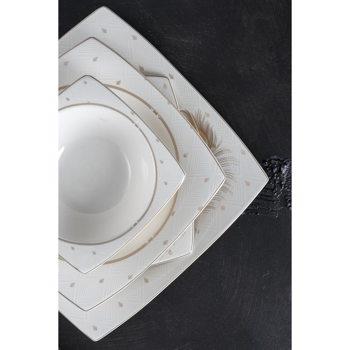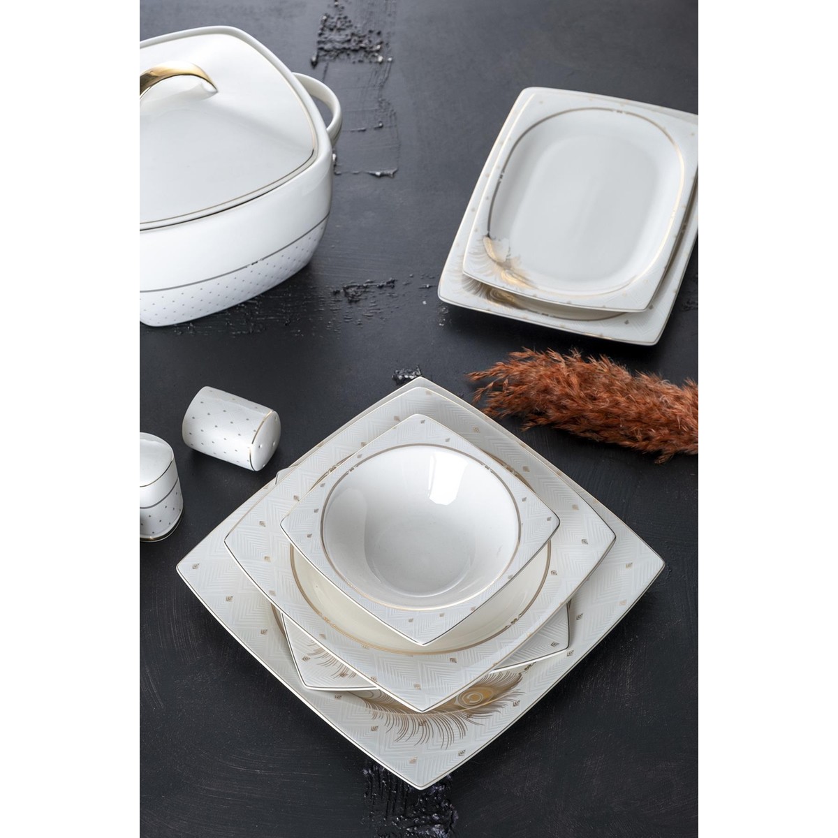 Kare formuna sahip, uzun ömürlü kullanılabilen gold çizgileri ve modern tasarım hatları ile sofralarınıza farklı bir soluk getirecek Henna 60 Parça Yemek Takımı…