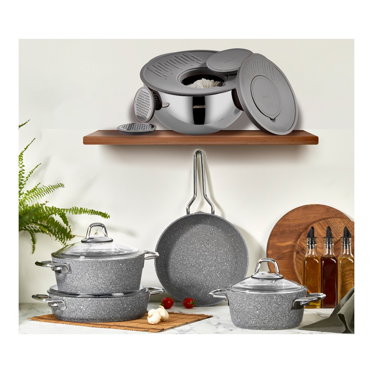Amboss 12 Parça Lusi Seti , mutfaklarınızda profesyonel bir deneyim yaşamanızı sağlayacak kapsamlı bir settir. Paslanmaz çelik ve granit malzemelerin bir araya gelmesiyle oluşan bu set,