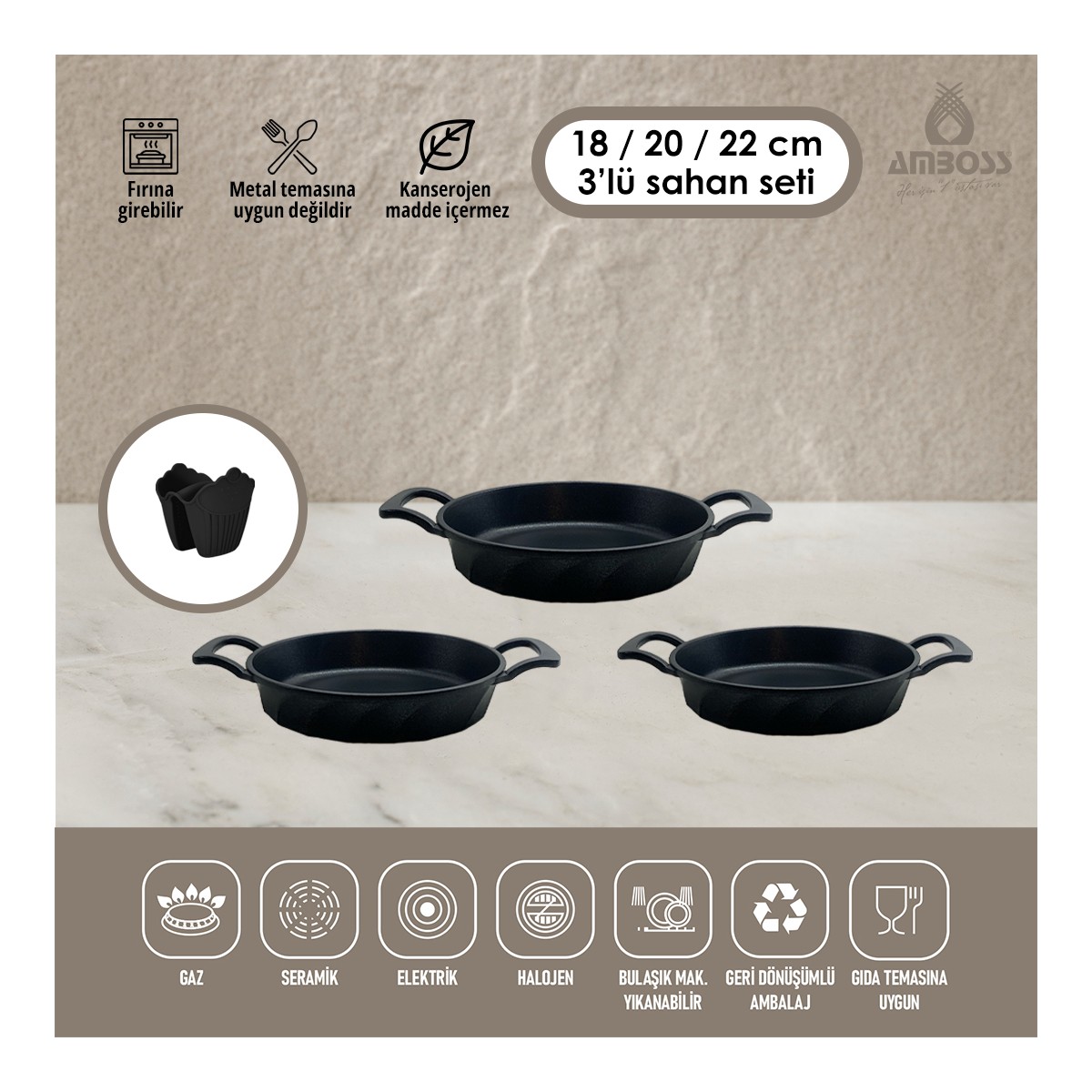 Amboss 3 Parça Kuvars Sahan Seti, mutfaklarınızda profesyonel bir deneyim yaşamanızı sağlayacak, dayanıklı ve şık bir tasarıma sahip. 18 cm, 20 cm ve 22 cm olmak üzere farklı boyutlardaki sahanları ile her türlü yemeği rahatlıkla pişirebilirsiniz.