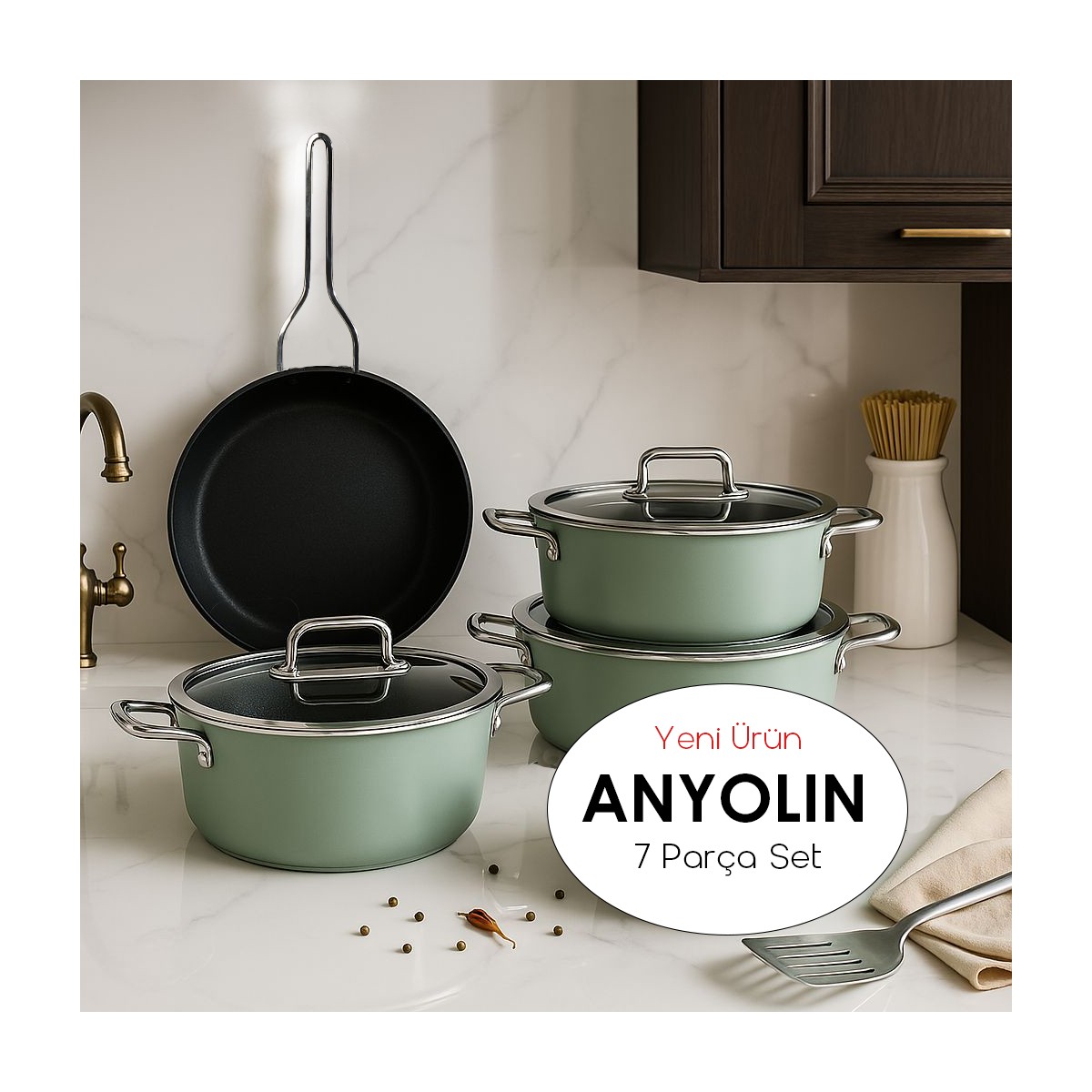 Amboss Anyolin 7 Parça Titanyum Kaplama Tencere Tava Seti (Yeşil)