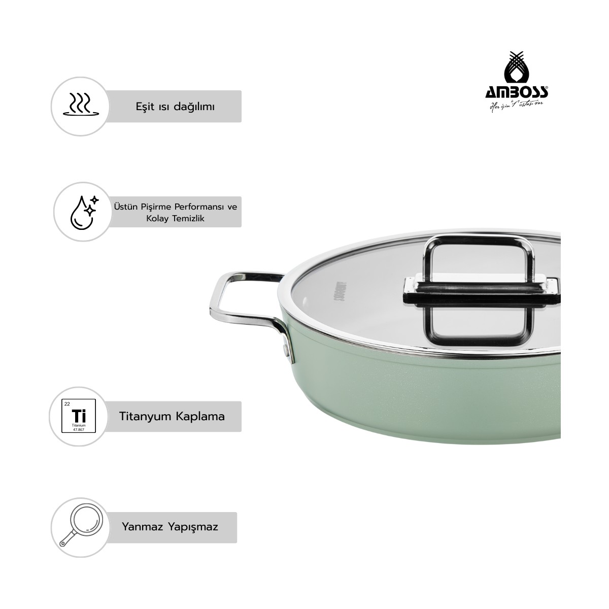 Yemek yapmayı bir keyif haline getiren Amboss Anyolin 7 Parça Titanyum Kaplama Tencere Tava Seti, modern mutfakların aradığı tüm özellikleri bir arada sunuyor. Yeşilin göz alıcı şıklığıyla tasarlanan bu set, yanmaz yapışmaz yüzeyi ve üstün teknolojisiyle yemeklerinizi tam kıvamında pişirmenizi sağlıyor.