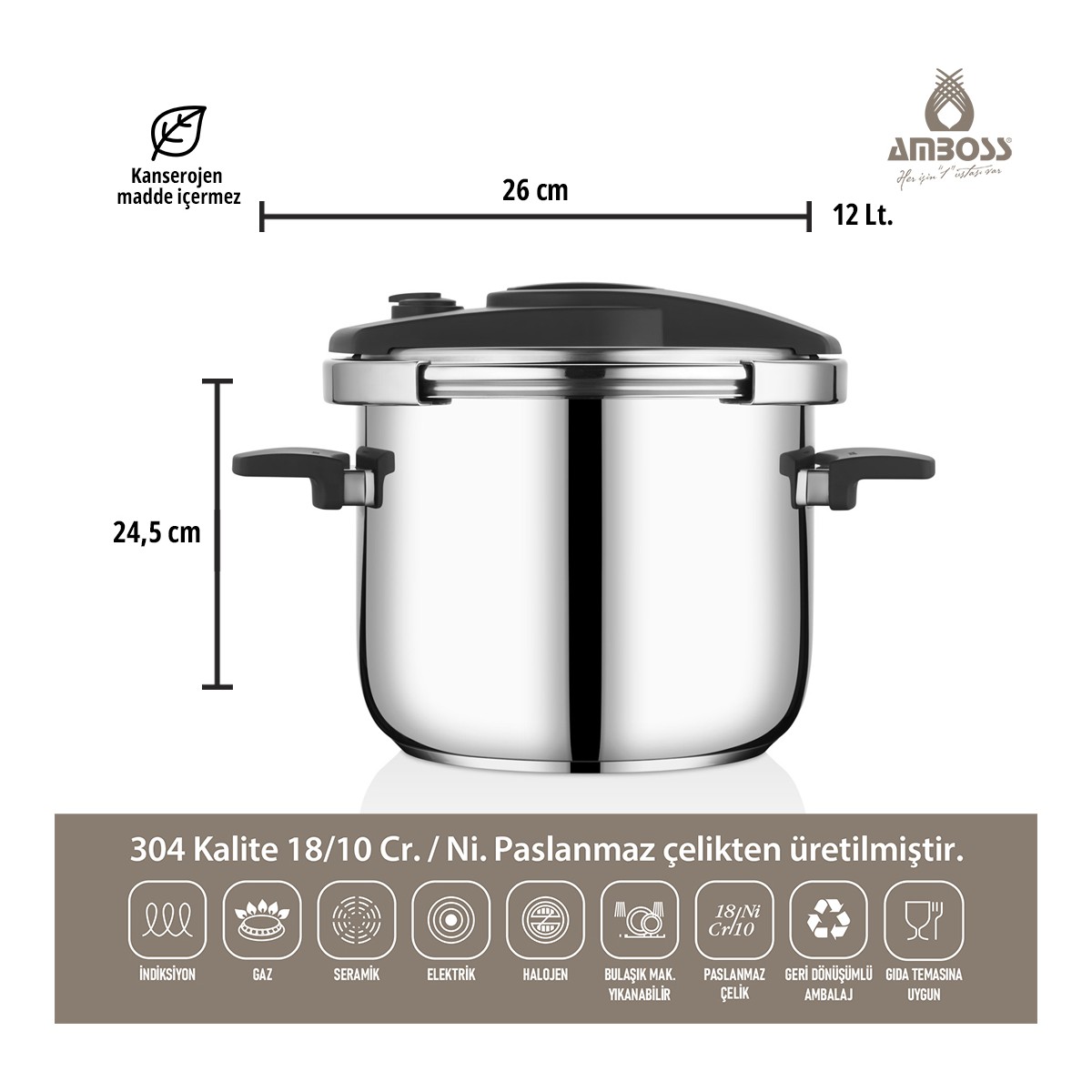 Amboss Enio Plus 12 Lt Matik Paslanmaz Çelik İndüksiyon Uyumlu Düdüklü Tencere