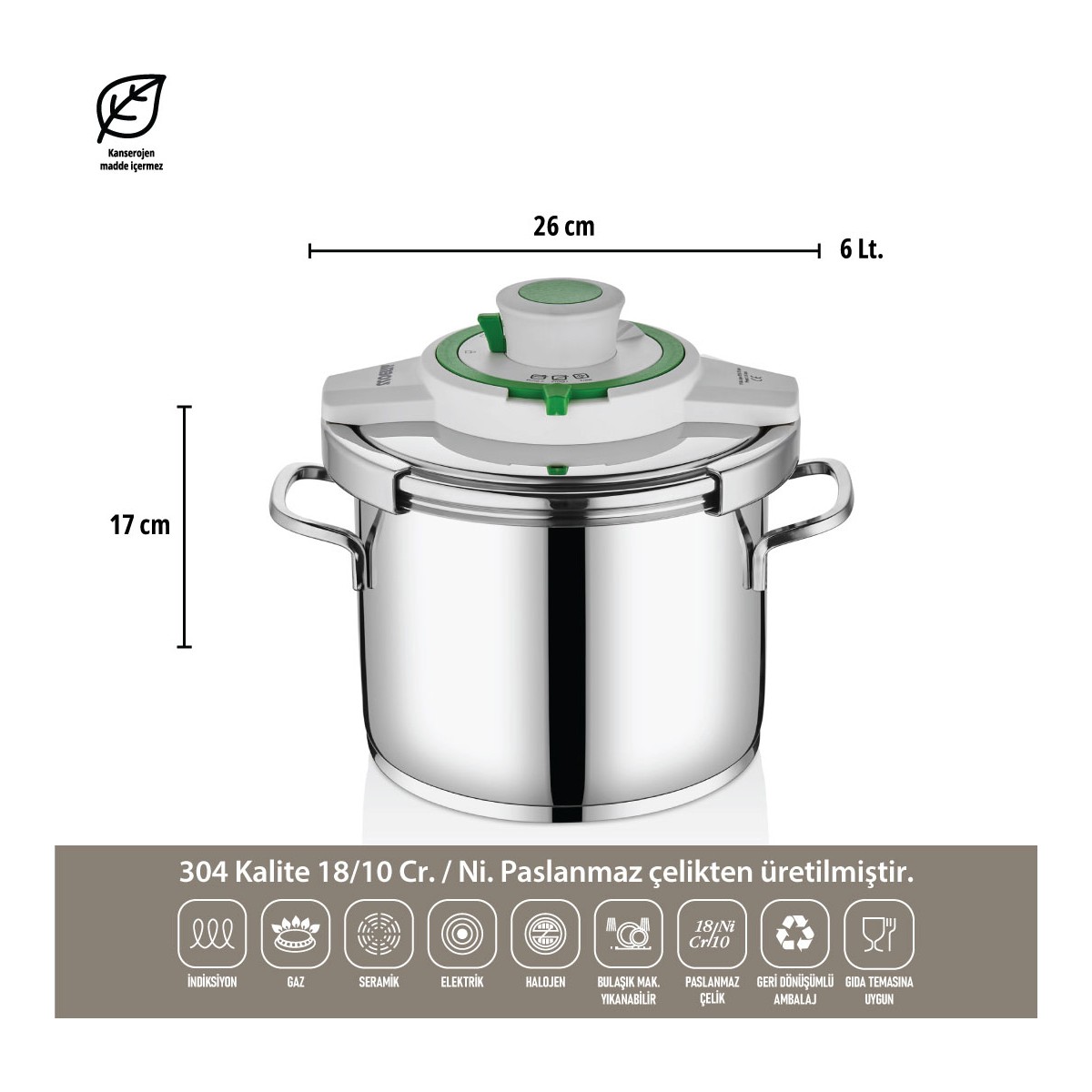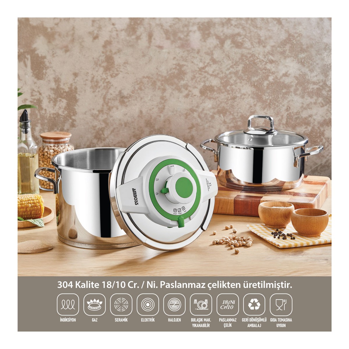 Amboss 4-6 Litre Matik Düdüklü Tencere Seti (Yeşil): Lezzetli ve Pratik Yemekler İçin Vazgeçilmeziniz! Amboss 4-6 Litre Matik Düdüklü Tencere Seti , mutfakta zaman kazandıran ve lezzetli yemekler hazırlamanızı sağlayan pratik bir çözüm! Özellikle yoğun yaşam temposunda yemek yapmaya vakit bulamayanlar için ideal bir seçenek. Kısa Sürede Lezzetli Yemekler Bu set ile kemikli etinizi 12 dakikada, kuzu etinizi 9 dakikada, biber dolmanızı 4 dakikada, nohut yemeğinizi 22 dakikada ve kuru fasulyenizi de sadece 14 dakikada (maksimum %2 su kaybıyla) pişirebilirsiniz. Taze fasulyenizi ise 6 dakikada hazır hale getirebilirsiniz. Bu sayede hem zamandan tasarruf edersiniz hem de besin değerleri korunmuş, lezzetli yemekler yemenin keyfini çıkarırsınız. Ürünün Özellikleri Matik Sistem: Yemeklerinizi kolayca ve güvenle pişirmenizi sağlayan otomatik pişirme sistemi. ; Hızlı Pişirme: Geleneksel yöntemlere göre çok daha kısa sürede yemeklerinizi hazırlar. ; Enerji Tasarrufu: Hızlı pişirme özelliği sayesinde enerji tasarrufu sağlar. ; Paslanmaz Çelik: Dayanıklı ve hijyenik paslanmaz çelik gövde. ; Güvenli Kullanım: Çoklu güvenlik sistemi ile güvenle kullanılabilir. ; Kolay Temizlik: Bulaşık makinesinde yıkanabilir parçaları sayesinde temizliği kolaydır. ; Neden Amboss 4-6 Litre Matik Düdüklü Tencere Seti? Zaman Tasarrufu: Yoğun yaşam temposunda yemek yapma sürenizi önemli ölçüde kısaltır. ; Lezzetli Yemekler: Besin değerlerini koruyarak lezzetli yemekler hazırlamanızı sağlar. ; Pratik Kullanım: Kullanımı kolay ve güvenlidir. ; Çok Yönlü: Çeşitli yemekleri kısa sürede pişirmenize olanak tanır. ; Dayanıklılık: Uzun ömürlü kullanım için tasarlanmıştır. ; Amboss 4-6 Litre Matik Düdüklü Tencere Seti ile mutfakta daha fazla vakit kazanırken, ailenize ve sevdiklerinize lezzetli yemekler hazırlamanın keyfini çıkarın!