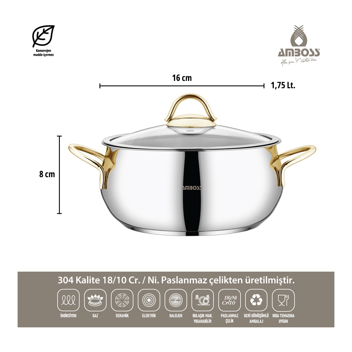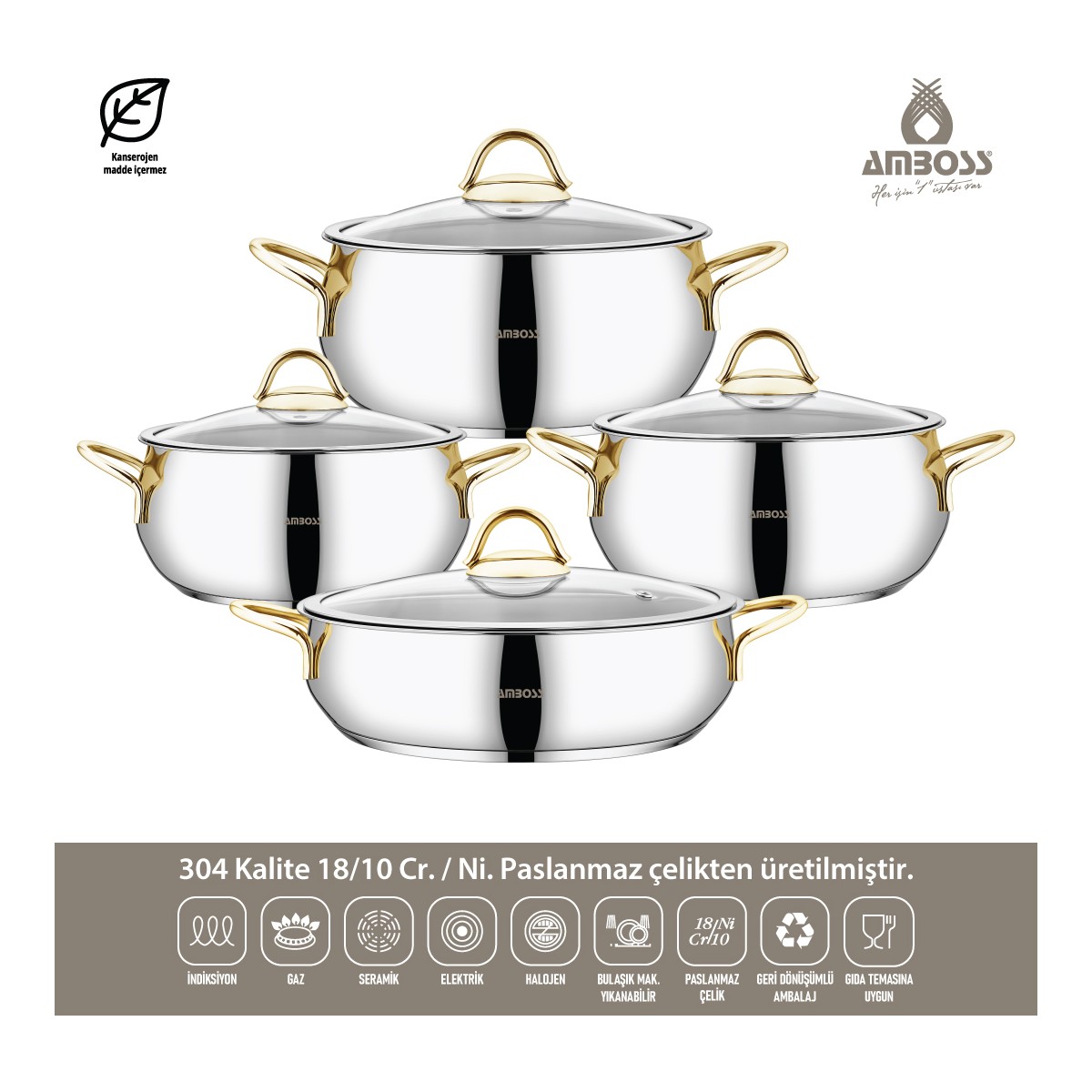 Amboss Stone Gold 8 Parça Çelik Tencere Seti – Cam Kapaklı, 16-24 cm, Gaz ve Halojen Ocaklara Uygun, Bulaşık Makinesinde Yıkanabilir