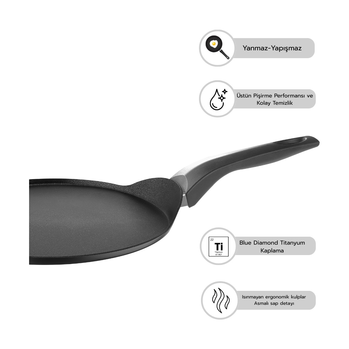 - Kusursuz Pişirme: Yapışmaz yüzeyi sayesinde krepleriniz kolayca tavadan ayrılır ve yanma riski olmaz.