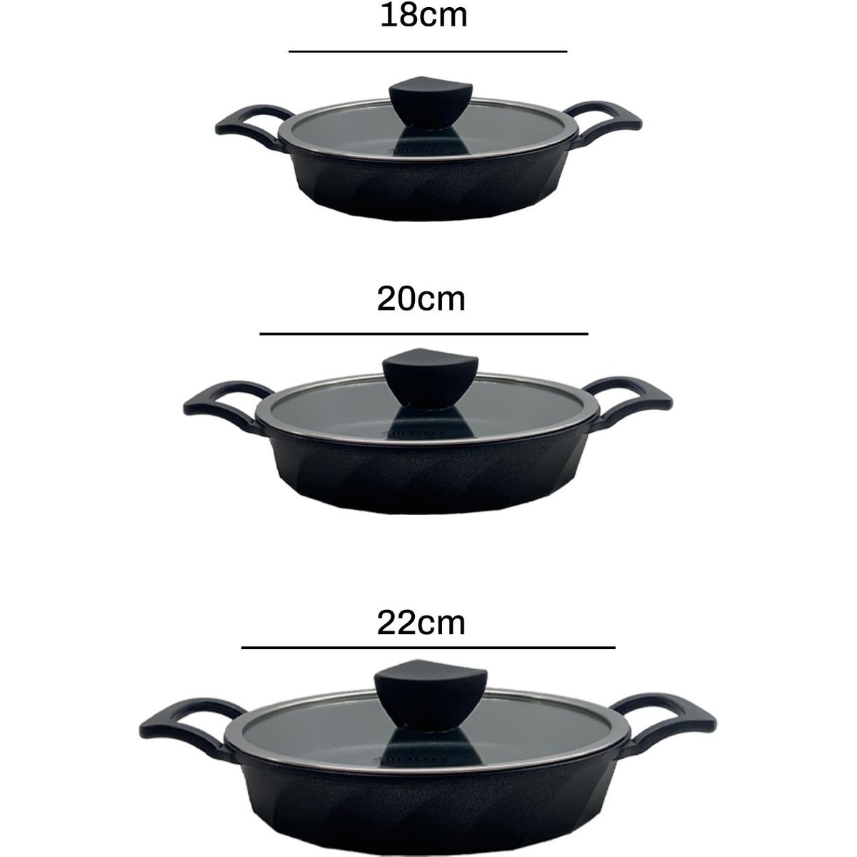 • Farklı Boyutlarla Her İhtiyaca Çözüm: Set içerisinde bulunan 18 cm, 20 cm ve 22 cm’lik sahanlar, ister küçük porsiyonlar hazırlayın ister kalabalık sofralar için yemekler pişirin, her zaman doğru boyutu bulmanızı sağlar. Cam kapaklar ise pişirme sürecini kolayca takip etmenize olanak tanır.