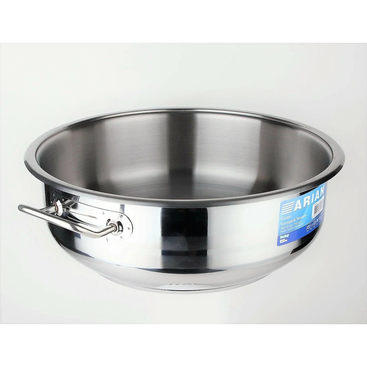 ARİAN GASTRO Basık Tencere, 34 cm genişliği, 13 cm derinliği ve 12,5 litre kapasitesiyle kalabalık aile yemekleri ve profesyonel mutfaklar için ideal bir üründür. Paslanmaz çelikten üretilen sağlam gövdesi ve ısıyı eşit dağıtan kapsül tabanı sayesinde yemeklerinizi tam kıvamında pişirmenize yardımcı olur.