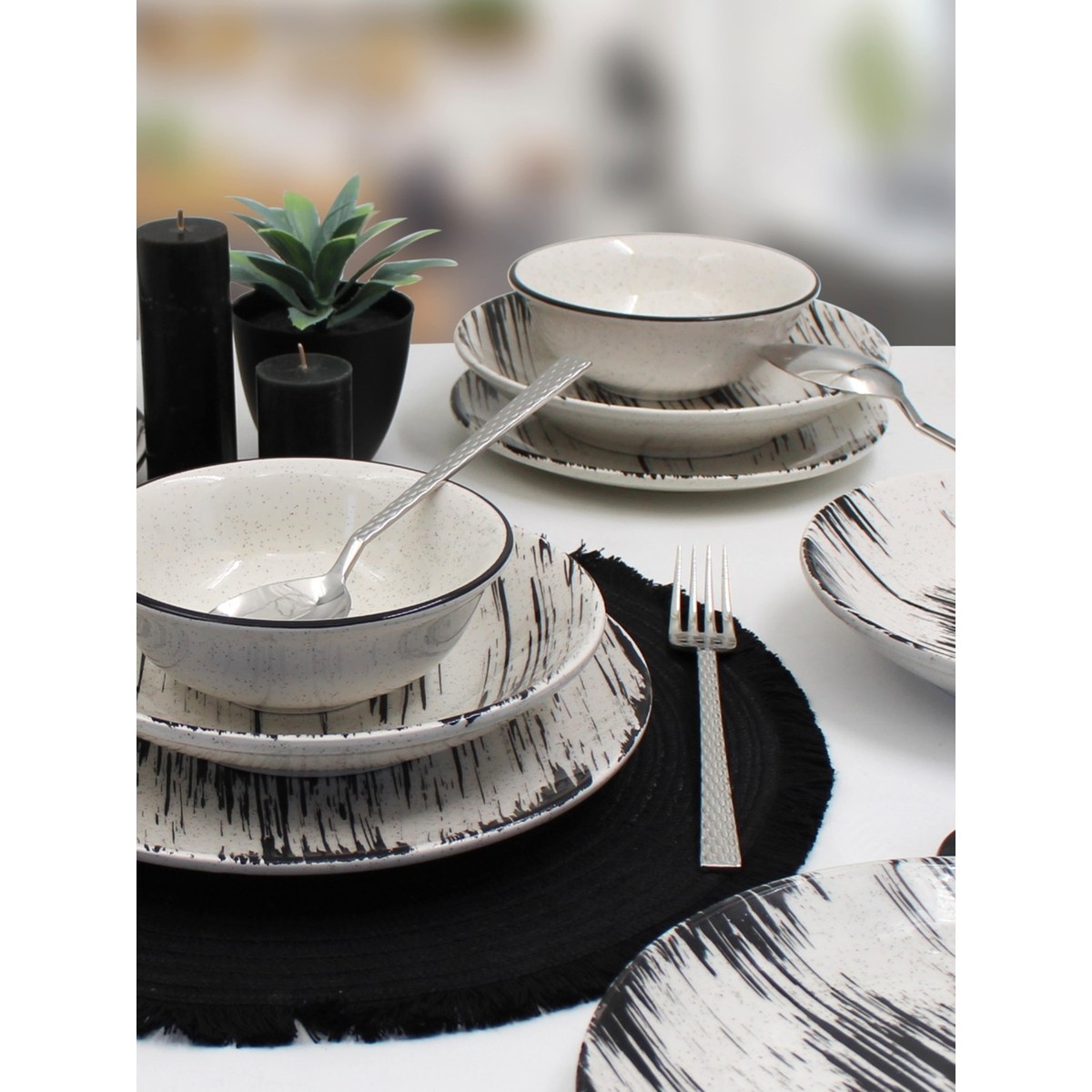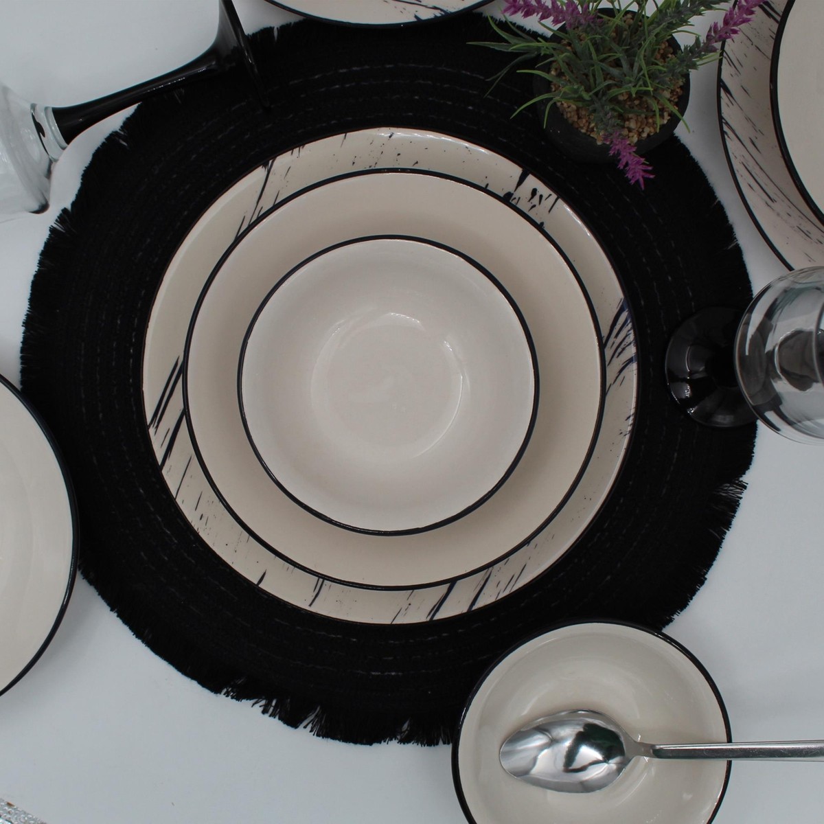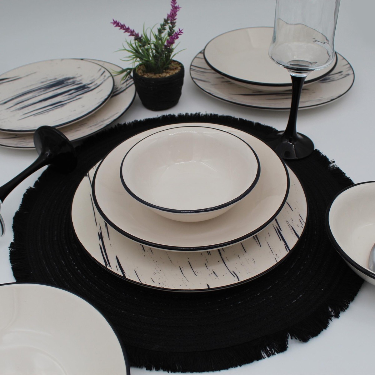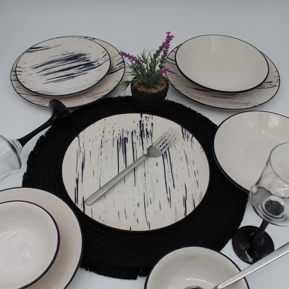 Arna Porselen Anka 48 Parça 12 Kişilik Siyah Desenli Yuvarlak Seramik Yemek Takımı, Mikrodalga ve Bulaşık Makinesine Uygun