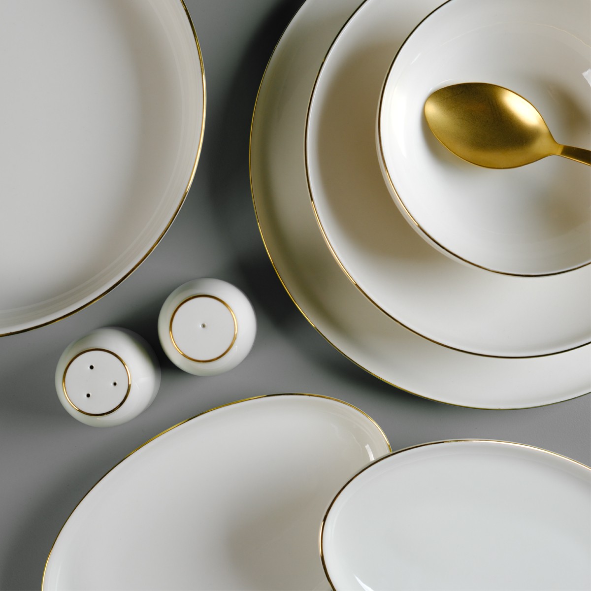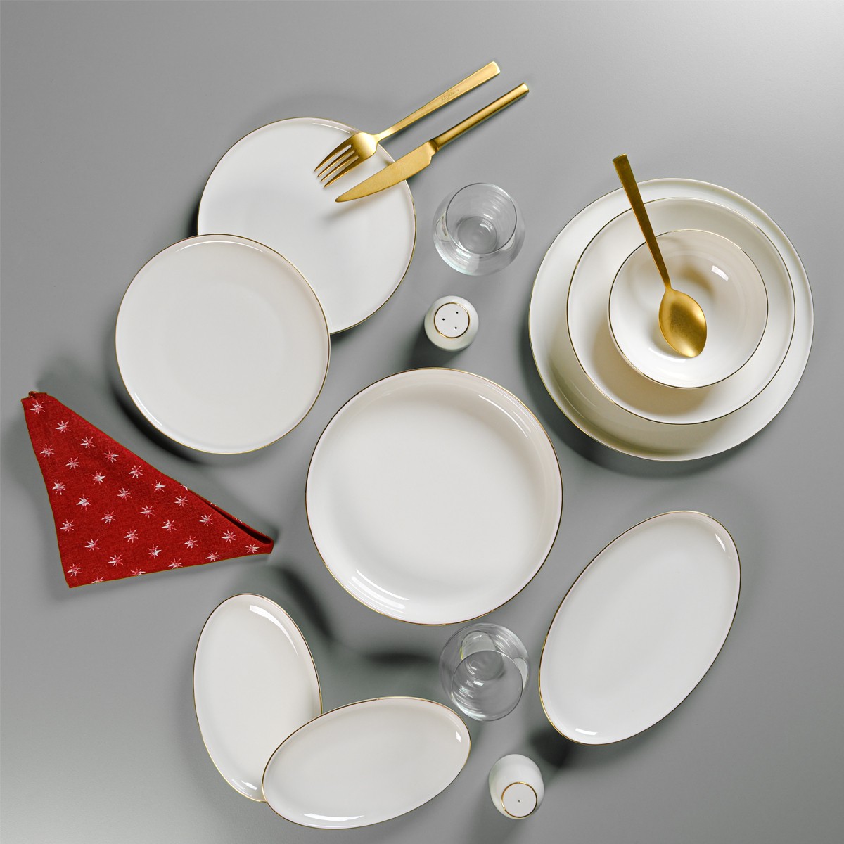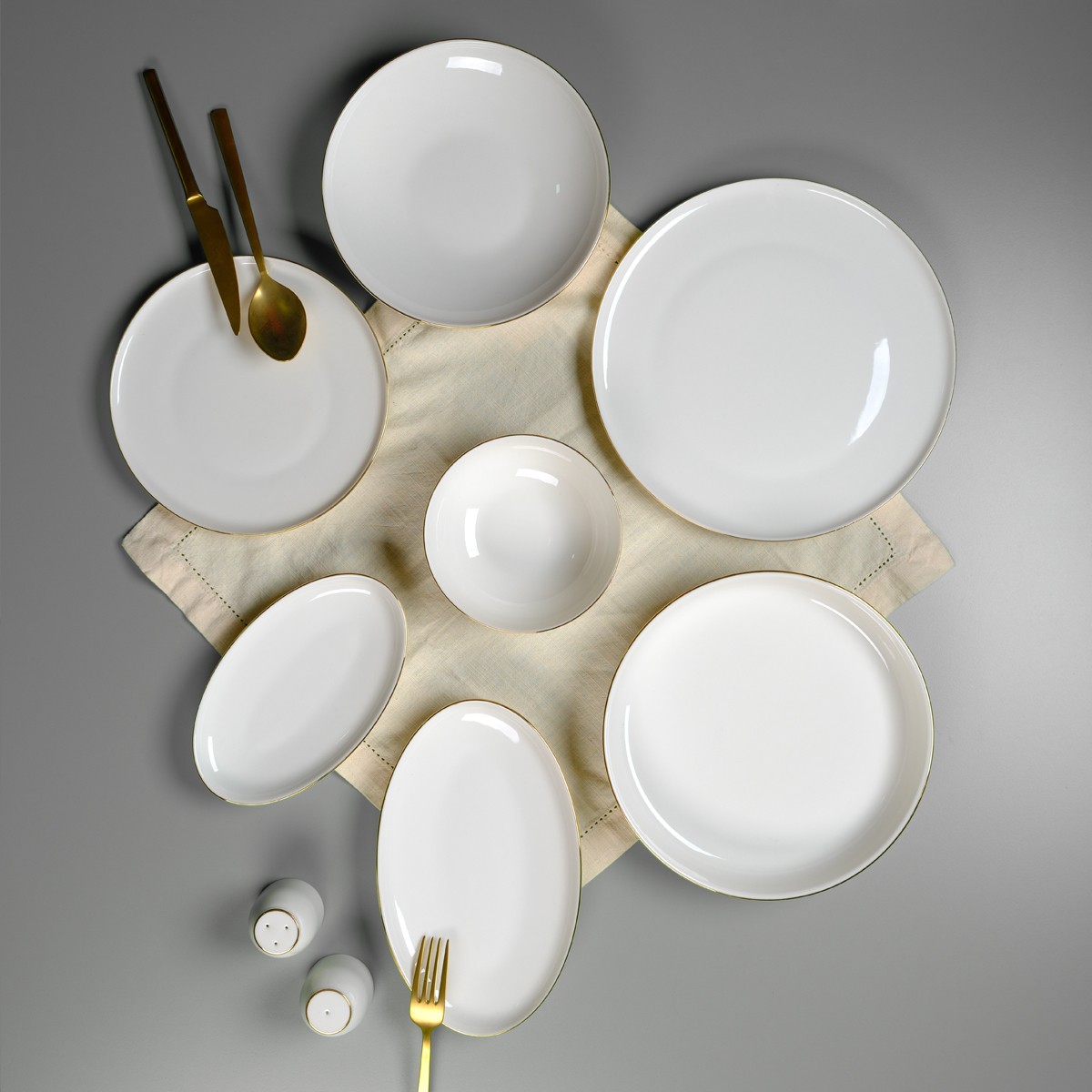 – ???? Çeşitli tabak ve kaseler — servis tabağı, pasta tabağı, çukur tabak, kase, kayık tabak ve salata kasesiyle tam donanım.