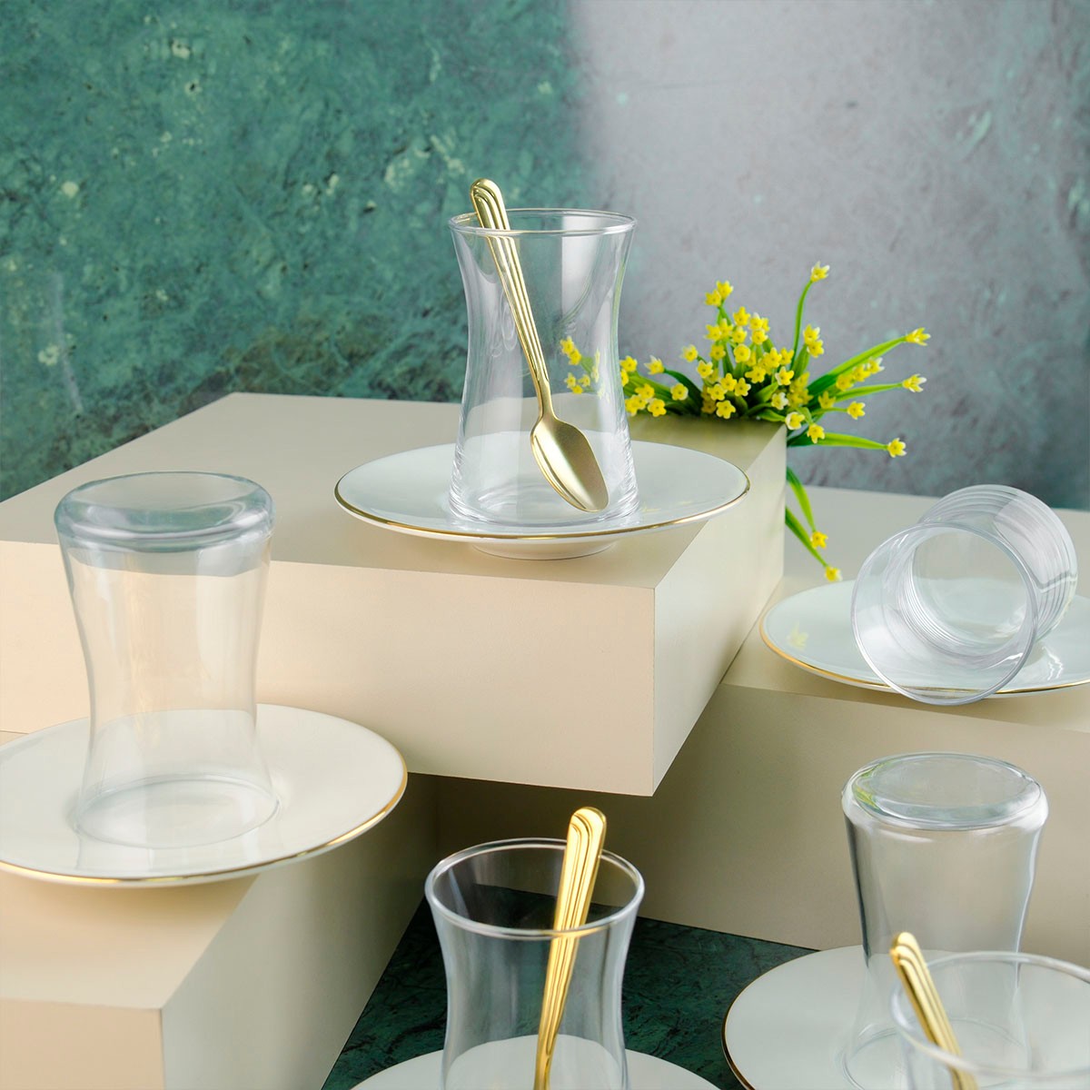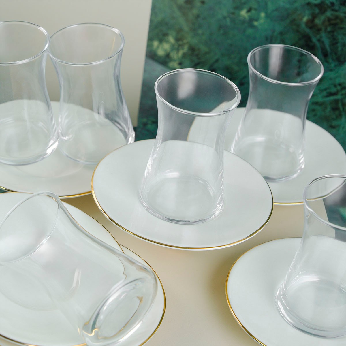 Çay Bardağı Takımı, zarif tasarımı ve altın yaldız detaylarıyla çay keyfinizi bir üst seviyeye taşıyor.