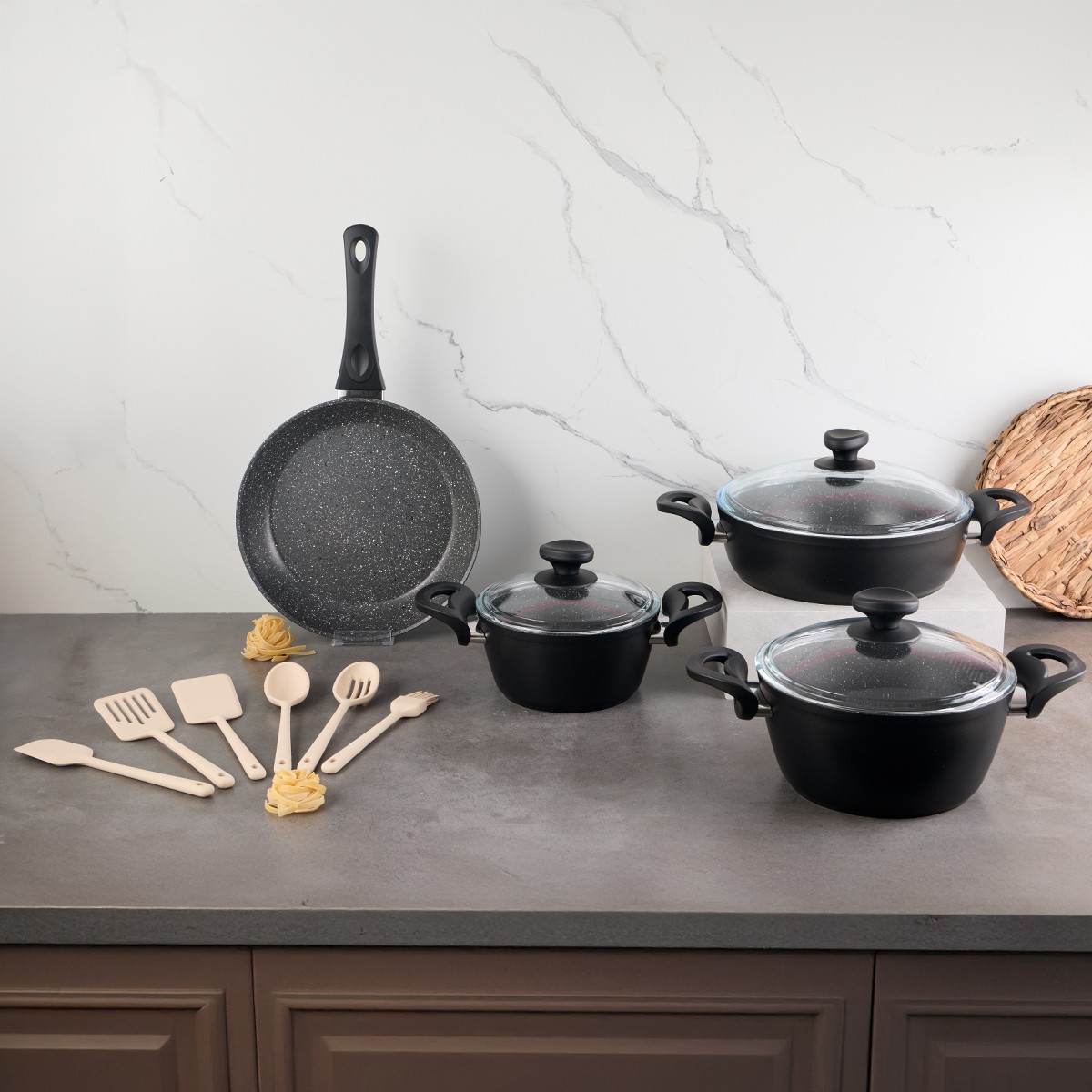 Mutfakta şıklık ve işlevselliği bir arada sunan bu özel set, günlük kullanım için ihtiyacınız olan her şeyi bir araya getiriyor. Granit kaplamalı tencereleri ile sağlıklı ve yapışmaz pişirme deneyimi sunarken, ısıya dayanıklı silikon servis setiyle yemek hazırlığınızı kolaylaştırır.