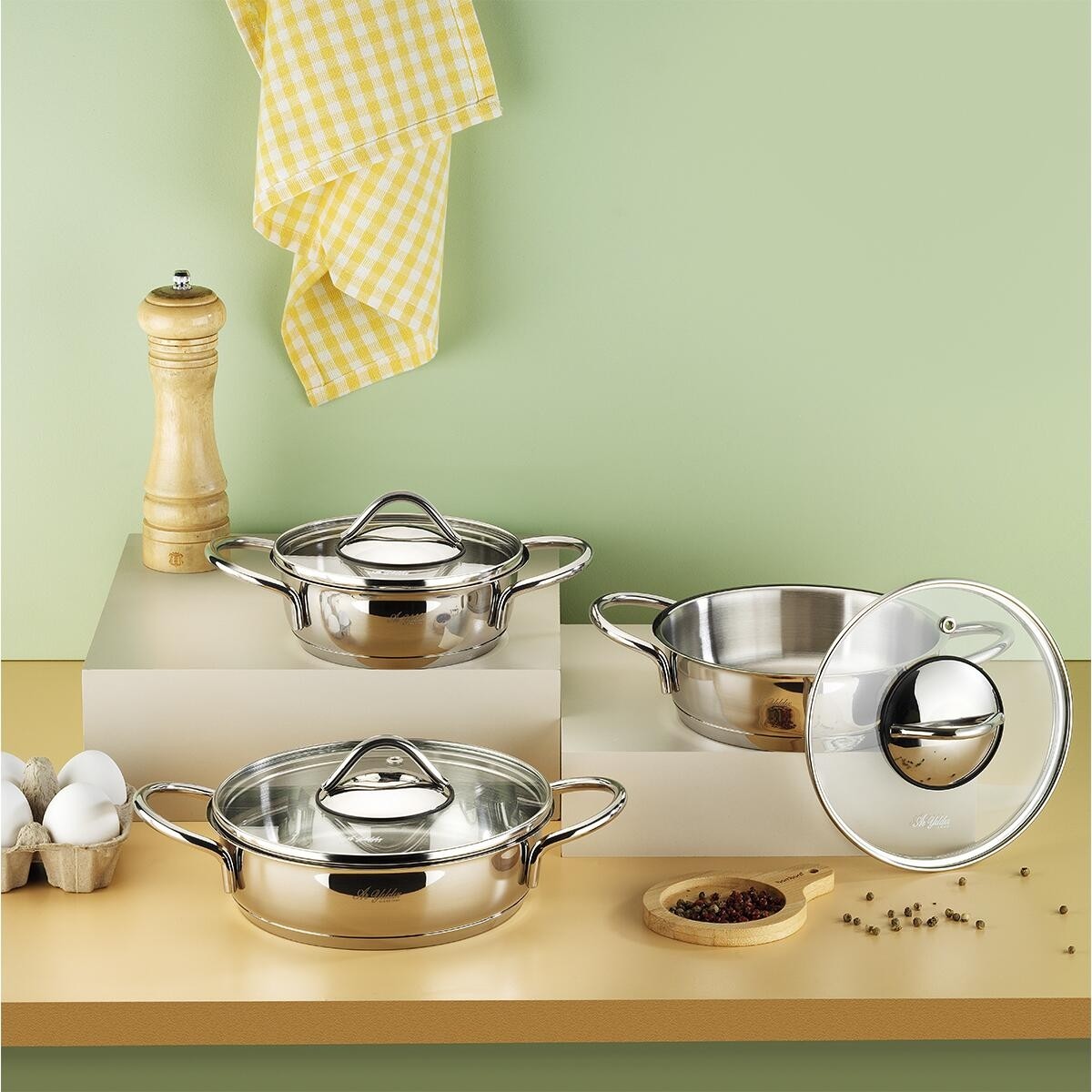 Aryıldız Soho Sahan Seti yüksek kalite paslanmaz çelik gövdesi ve kapsül tabanı ile ısıyı tüm yüzeylere eşit bir şekilde yayarak yemeklerinizin proteinlerini kaybetmeden pişmelerini sağlamaktadır.
