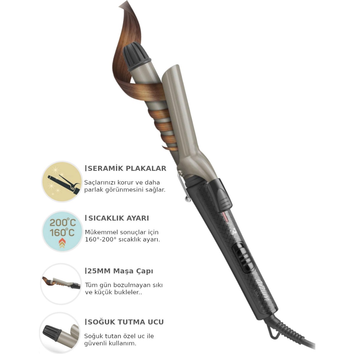 Arzum Lisa saç maşanızın uç kısmında soğuk tutan özel bir ısı malzemesi kullanılmıştır. Saçınızı şekillendirirken güvenle kullanabilirsiniz.