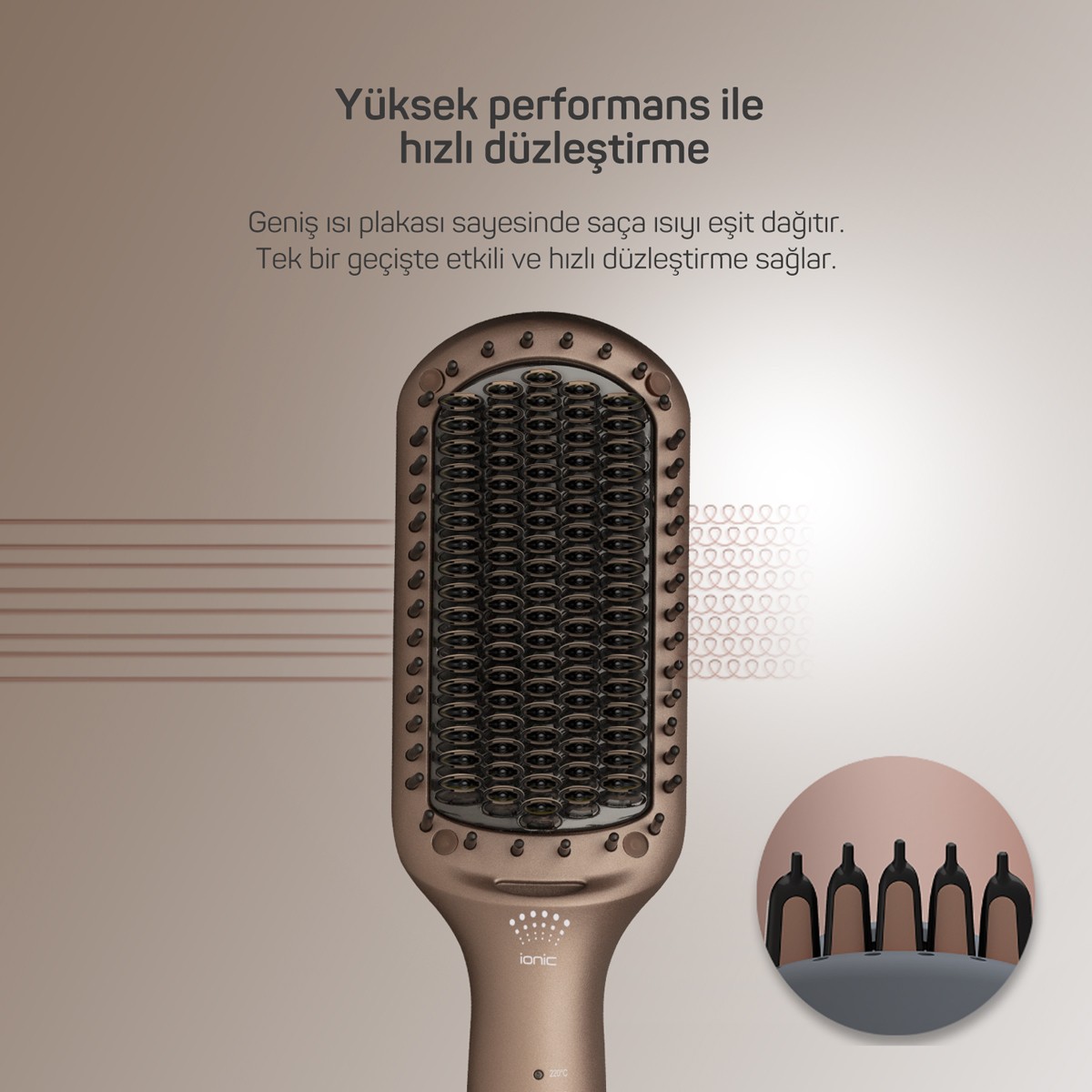 Geniş seramik kaplı tarak dişleri sayesinde daha etkili düzleştirme sağlar.