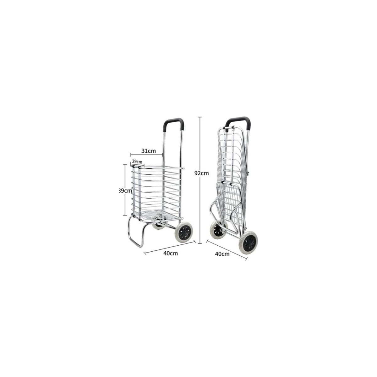 KATLANABİLİR TAŞINABİLİR ALIŞVERİŞ VE TAŞIMA ARABASIÜrün ÖzellikleriBu taşıma arabası, dayanıklı alüminyum çerçeveye sahiptir ve maksimum 20-30 kg yük taşıma kapasitesi sunar. Açık hali 92 cm yüksekliğe ve 40 cm genişliğe sahip olan ürün, kapalı halde kompakt bir şekilde muhafaza edilebilir. Sepeti 39 cm derinliğinde, 31 cm genişliğinde ve 29 cm boyutundadır.Bu taşıma arabası, market, pazar veya AVM alışverişlerinde kolaylık sağlar. Ayrıca ağır yüklerin taşınması, depo ve ofislerde küçük boyutlu kutu ya da eşyaların taşınması için uygundur. Seyahatlerde bagaj taşıma için de ideal bir çözümdür.Tekerlekleri, geniş ve dayanıklı lastik yapıya sahiptir, bu da zorlu yüzeylerde kolay hareket imkanı sunar. Ergonomik ve yumuşak tutma sapı, uzun süreli kullanımda bile rahatlık sağlar.Paket İçeriği1 adet Katlanabilir Taşınabilir Alışveriş ve Taşıma Arabası