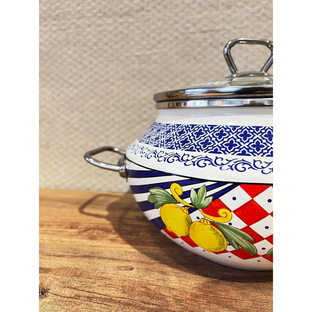 Geleneksel desenleri modern dokunuşlarla buluşturan bu 22 cm çapında emaye tencere, canlı limon desenleri ve kırmızı-beyaz geometrik formuyla mutfağınızda fark yaratır. 14 cm derinliği sayesinde hem sulu yemekler hem de sebze yemekleri için geniş hacimli ve pratik bir kullanım sunar.