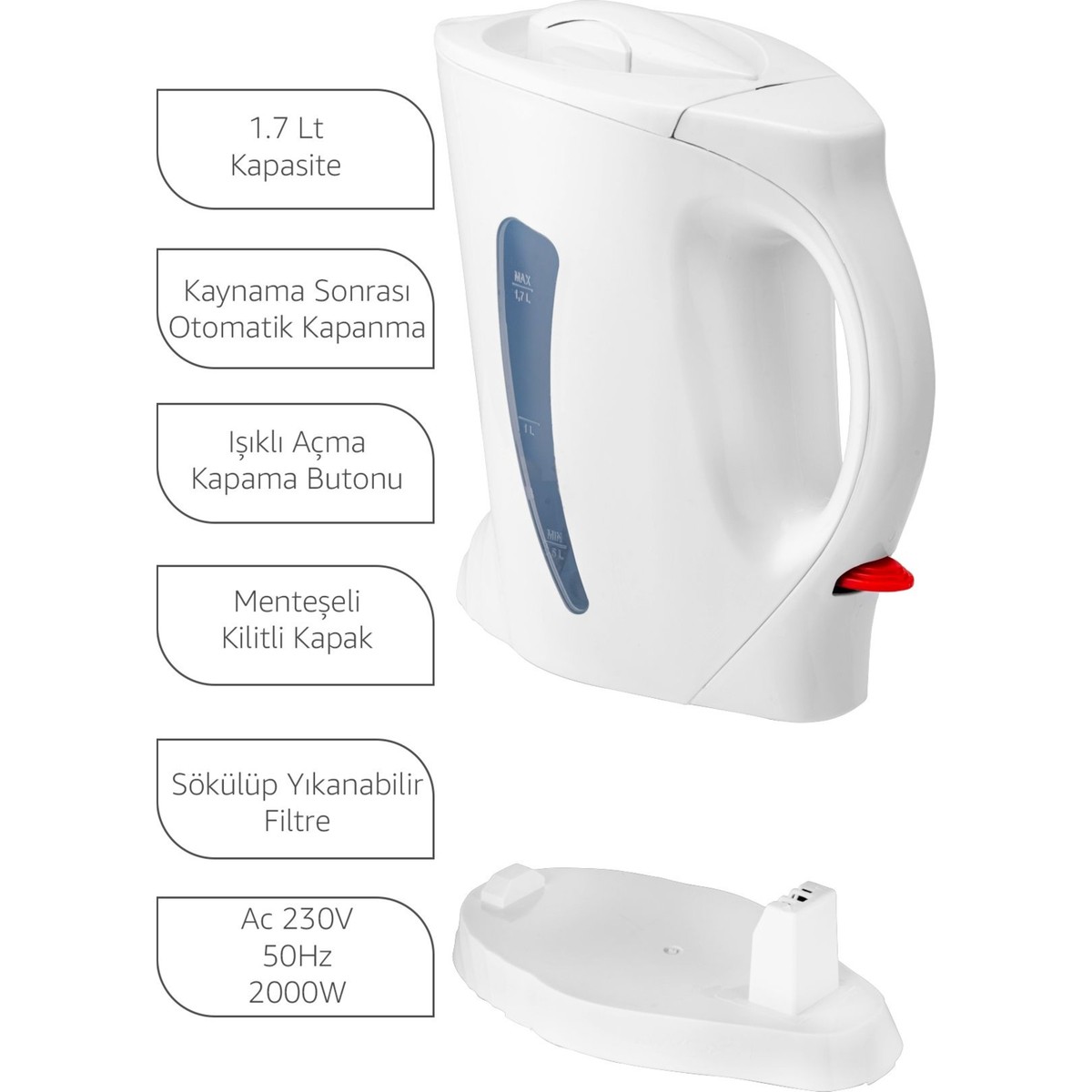 – ✅ 1.7 litre geniş su hacmi — tek seferde daha fazla su ısıtma imkanı.