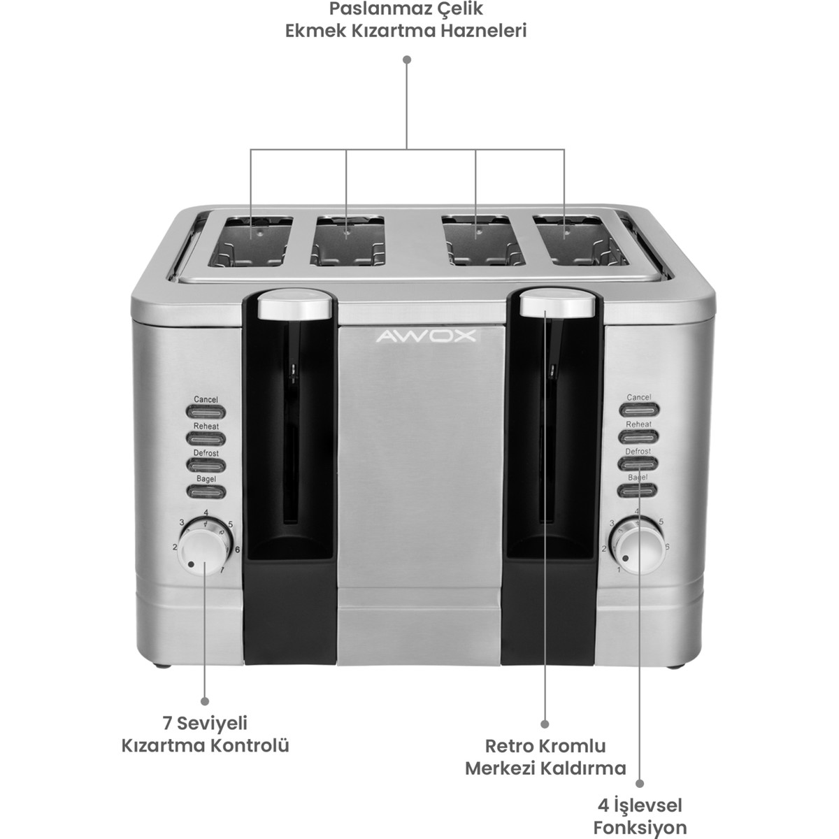 PASLANMAZ ÇELİK 4 DİLİM EKMEK KIZARTMA MAKİNESİ 7 SEVİYELİ KIZARTMA KONTROLÜ RETRO KROMLU MERKEZİ KALDIRMA DÖRT İŞLEV:İPTAL,BUZ ÇÖZME,BAGEL,ISITMA 1550-1850W VDE FİŞ.