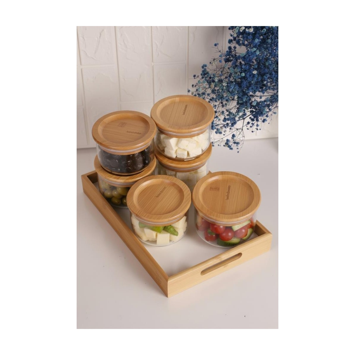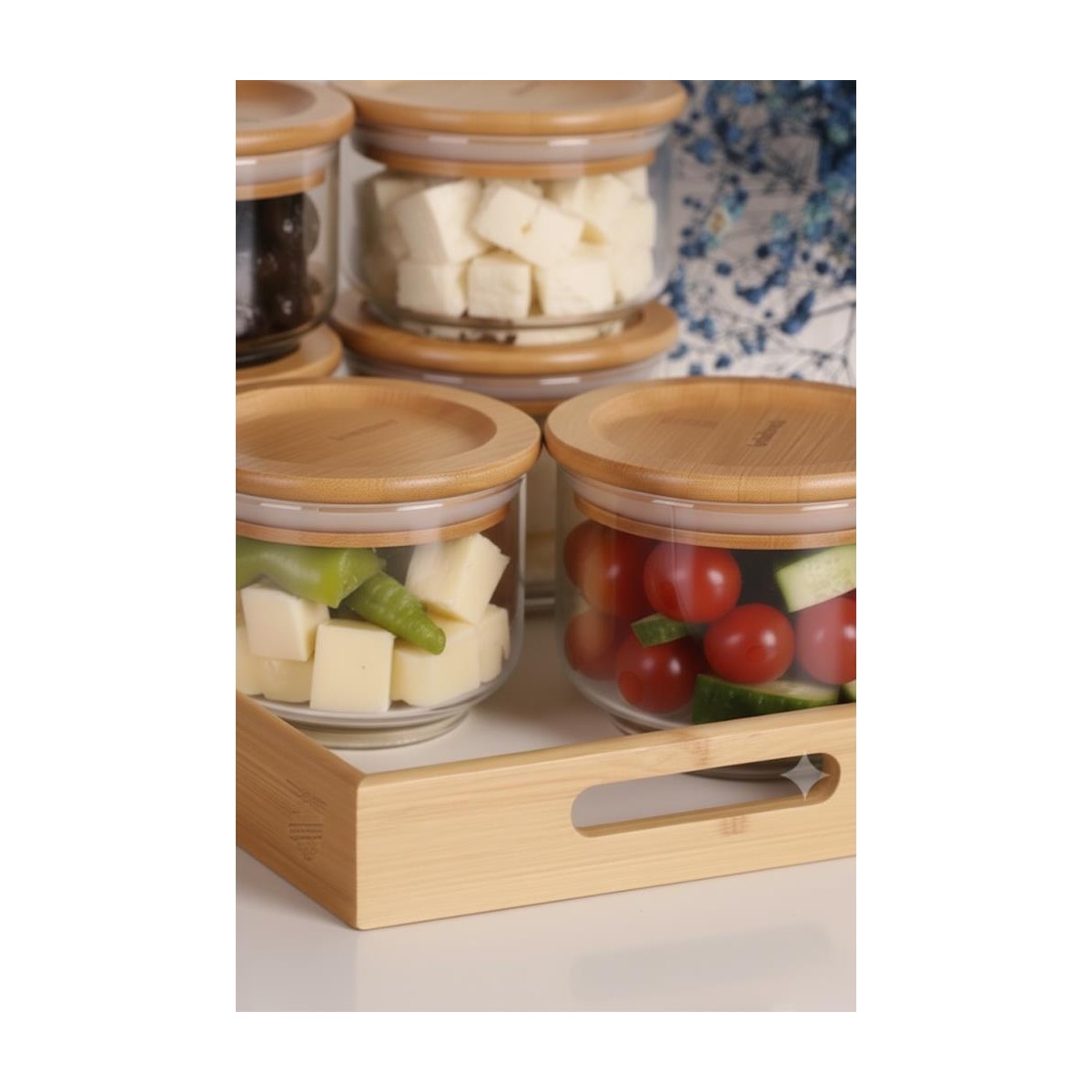 bambu kahvaltılık seti, 6’lı cam kahvaltılık, beyaz tepsili kahvaltı seti, bambu kapaklı cam kase, kahvaltı sunum seti, Bambum Duo, Marbella tepsi, kahvaltılık kap seti