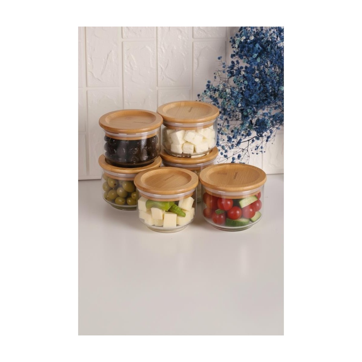 Bambum Duo 300 ml 6’lı Beyaz Tepsili Bambu Kapaklı Cam Kahvaltılık | Şık ve Düzenli Sunumlar İçin