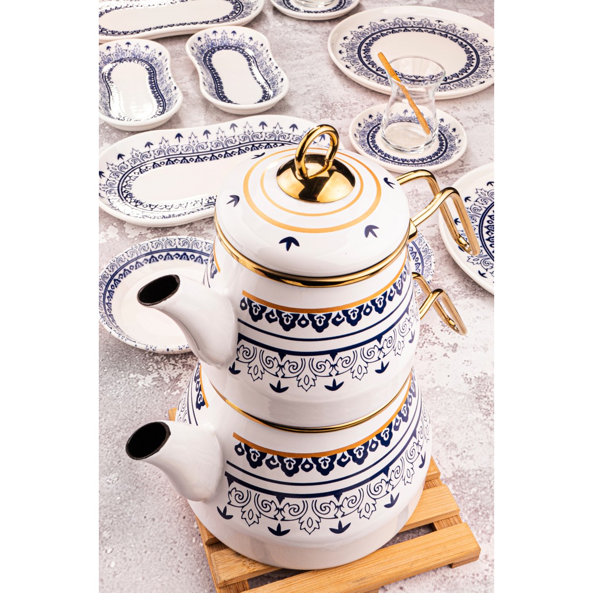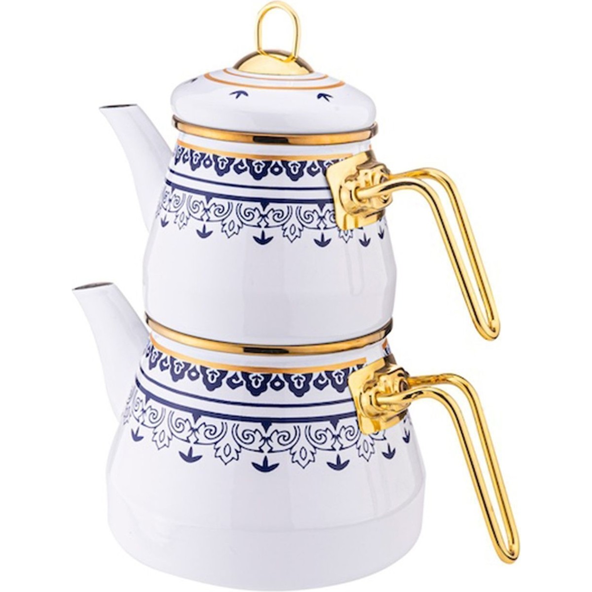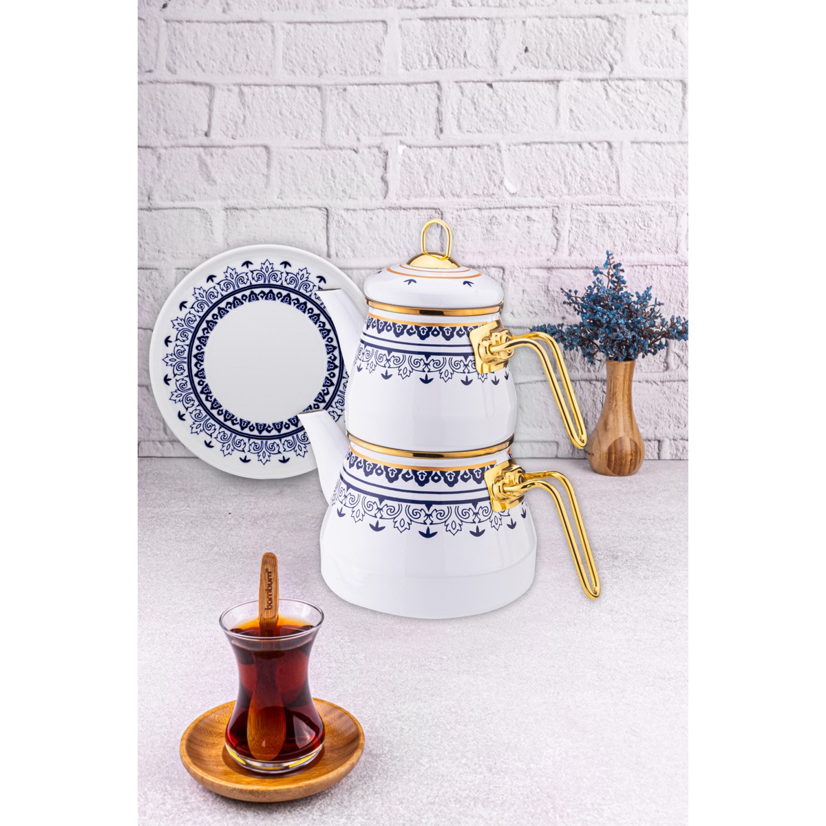 Bambum Emaye Çaydanlık Seti Bambu Desenli Yüksek Isıya Dayanıklı 1 lt Demlik 2 lt Alt Isıtıcı