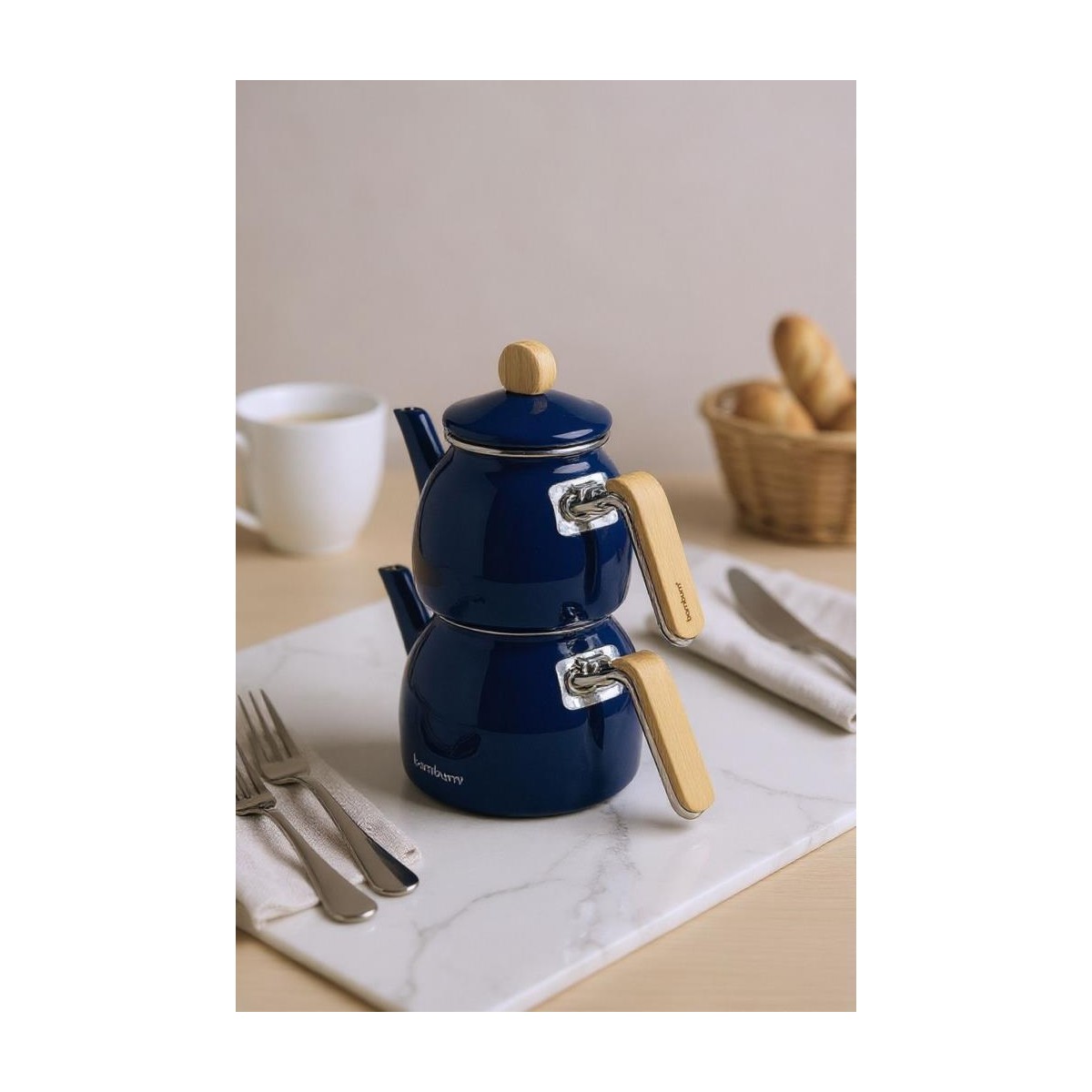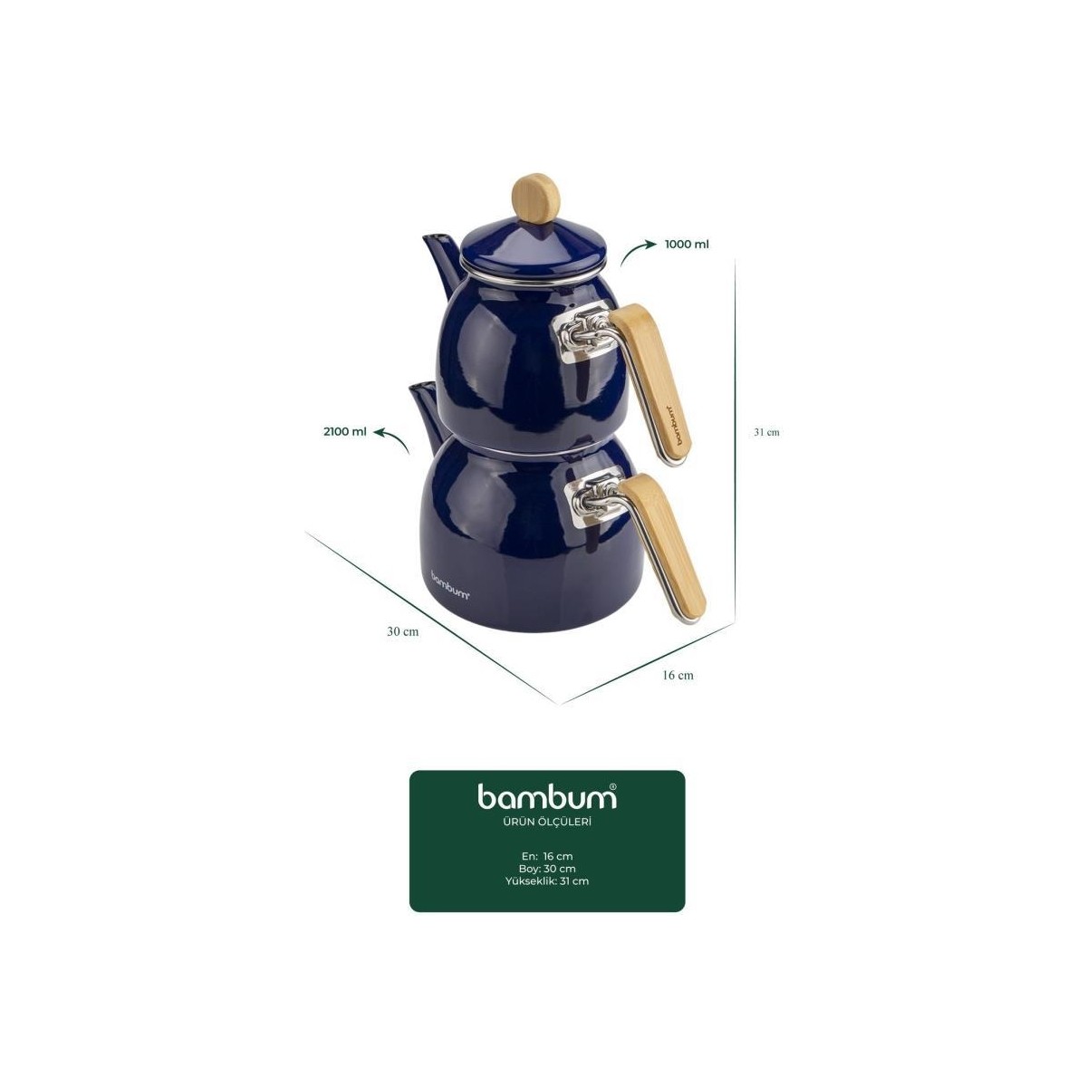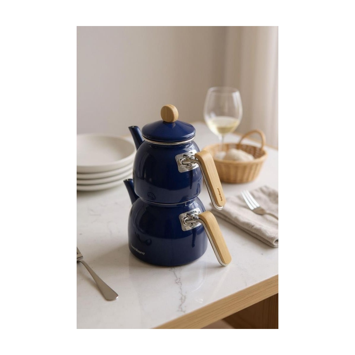 bambu kulplu çaydanlık, emaye çaydanlık seti, lacivert çaydanlık takımı, sultan çaydanlık, modern mutfak çaydanlığı, indüksiyon uyumlu çaydanlık, 2’li çaydanlık seti