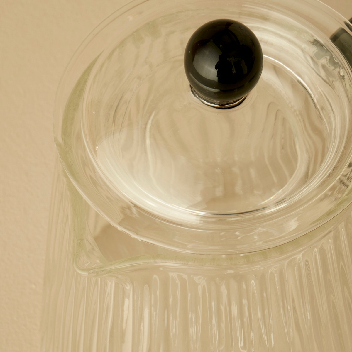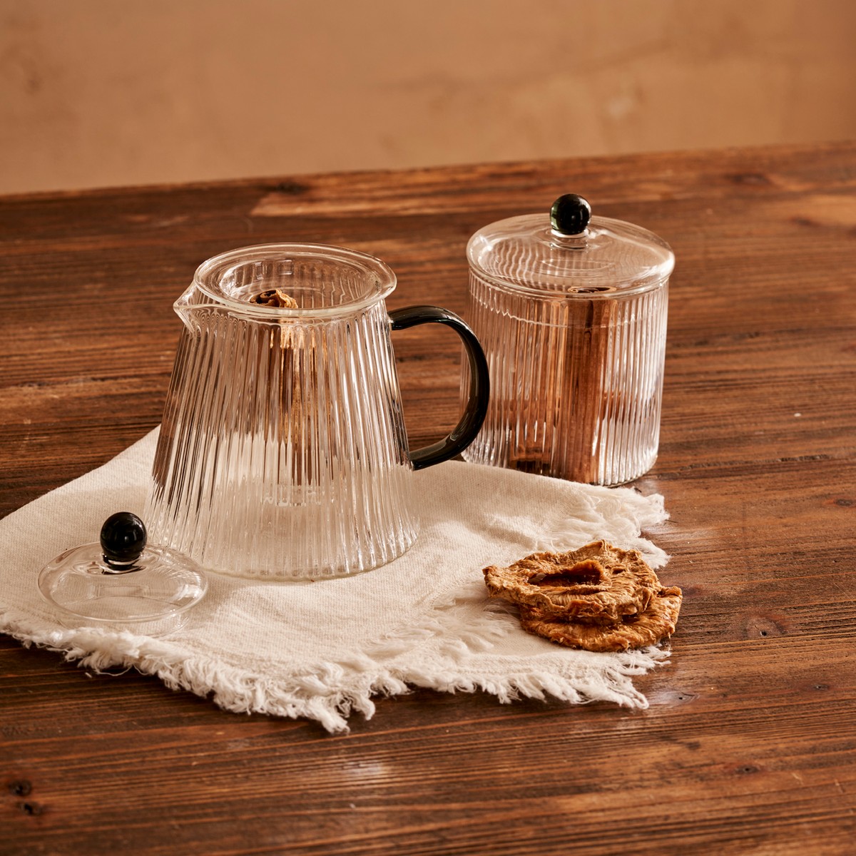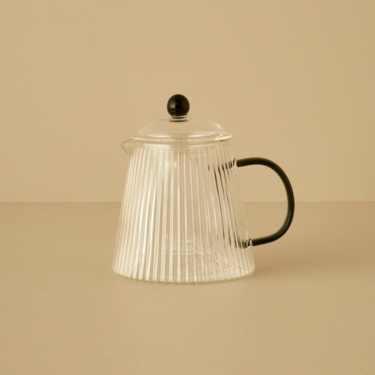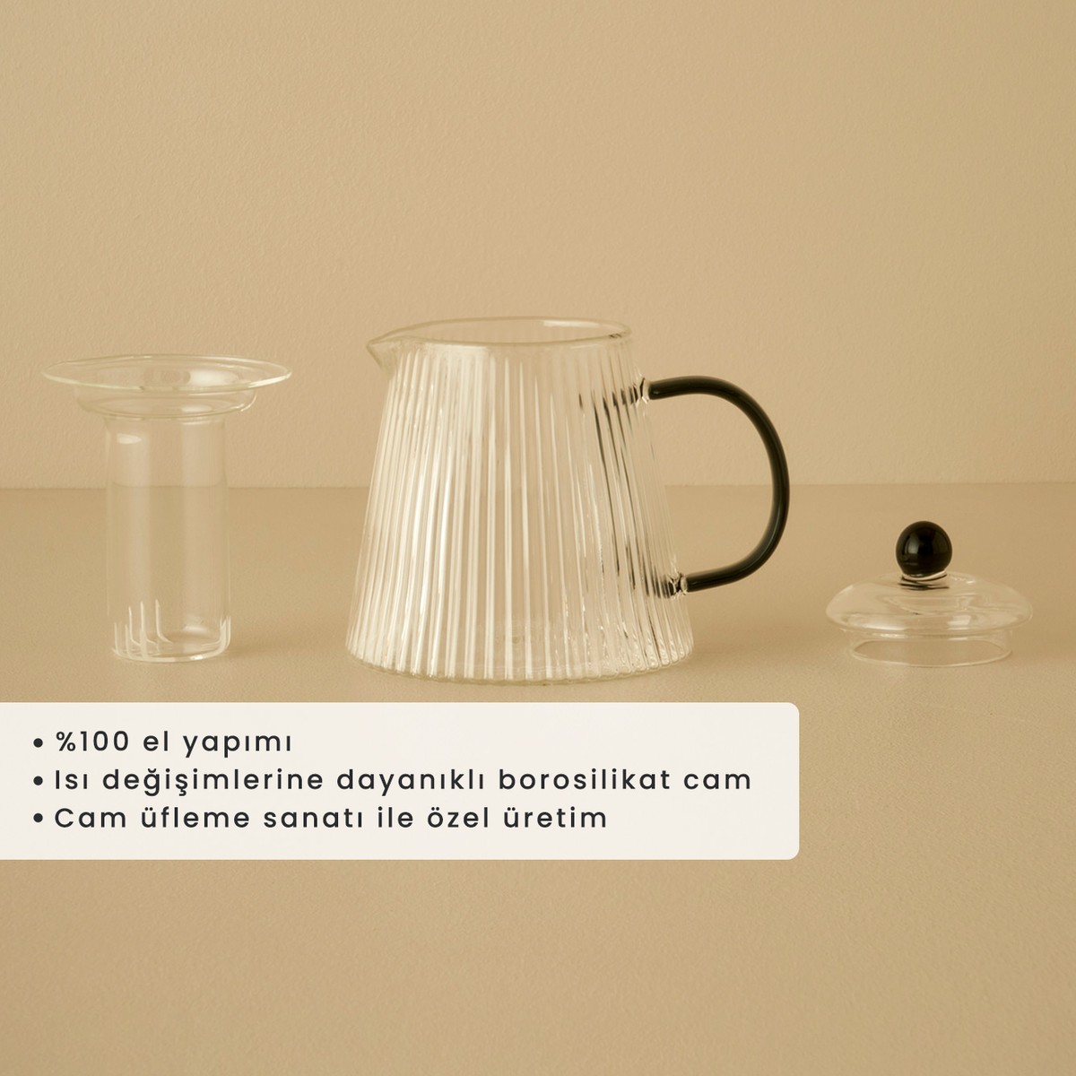 Siyah kulp detayıyla zarif bir görünüm sunan bu demlik, çizgili borosilikat camdan üfleme tekniğiyle titizlikle üretilmiştir. El yapımı olmasının getirdiği özgünlük ile her bir demlik, kendine has bir karakter taşır. Sıcak içeceklerinizi güvenle demlemek için ideal bir seçenek olan bu demlik, hem estetik hem de işlevsellik açısından mükemmel bir denge sağlar. Bulaşık makinesinde yıkamaya uygundur.