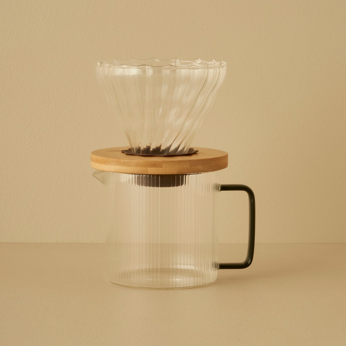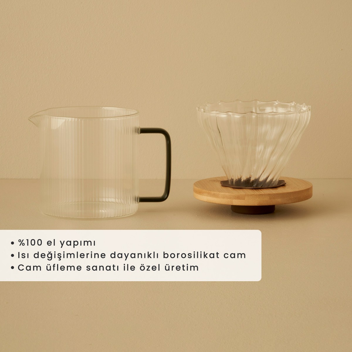 Siyah kulp detayıyla zarif bir görünüm sunan bu demleme seti, çizgili borosilikat camdan üfleme tekniğiyle titizlikle üretilmiştir. El yapımı olmasının getirdiği özgünlük ile her bir demleme seti, modern bambu detayıyla kendine has bir karakter taşır. Sıcak içeceklerinizi güvenle demlemek için ideal bir seçenek olan bu set, hem estetik hem de işlevsellik açısından mükemmel bir denge sağlar. Uzun süreli kullanım için bambu kısmının elde yıkanması önerilir, cam kısımları bulaşık makinesinde yıkanabilir.