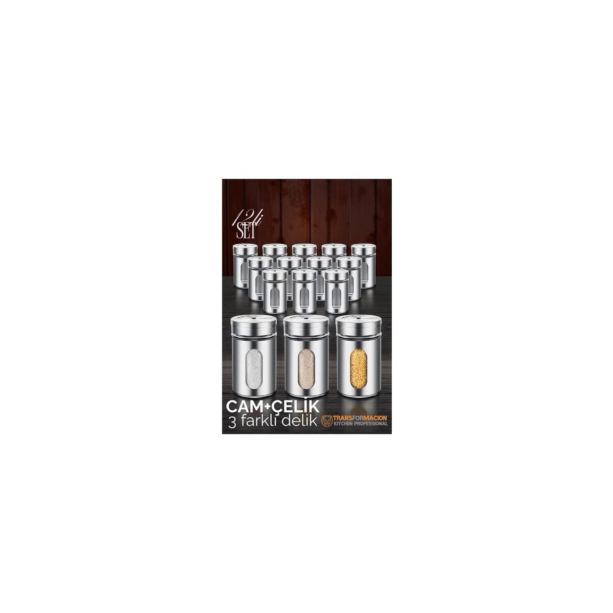 Bfs Cam+Çelik Tuzluk Biberlik Karabiberlik 3 Farklı Delikli 12 Li Set