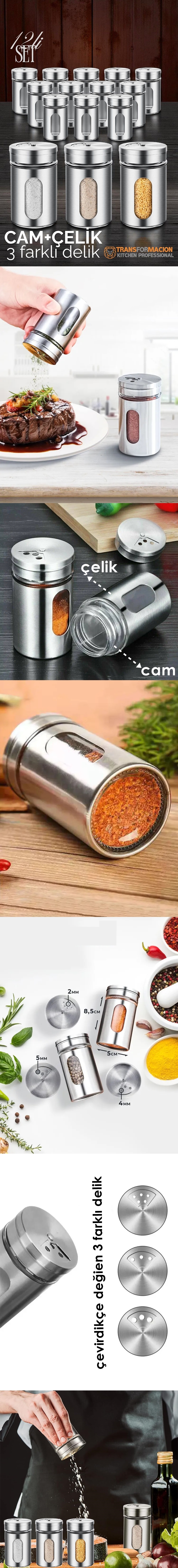 ?️ Cam Üzeri Çelik Baharatlık Seti – 12’li Ayarlanabilir Delikli Tasarım