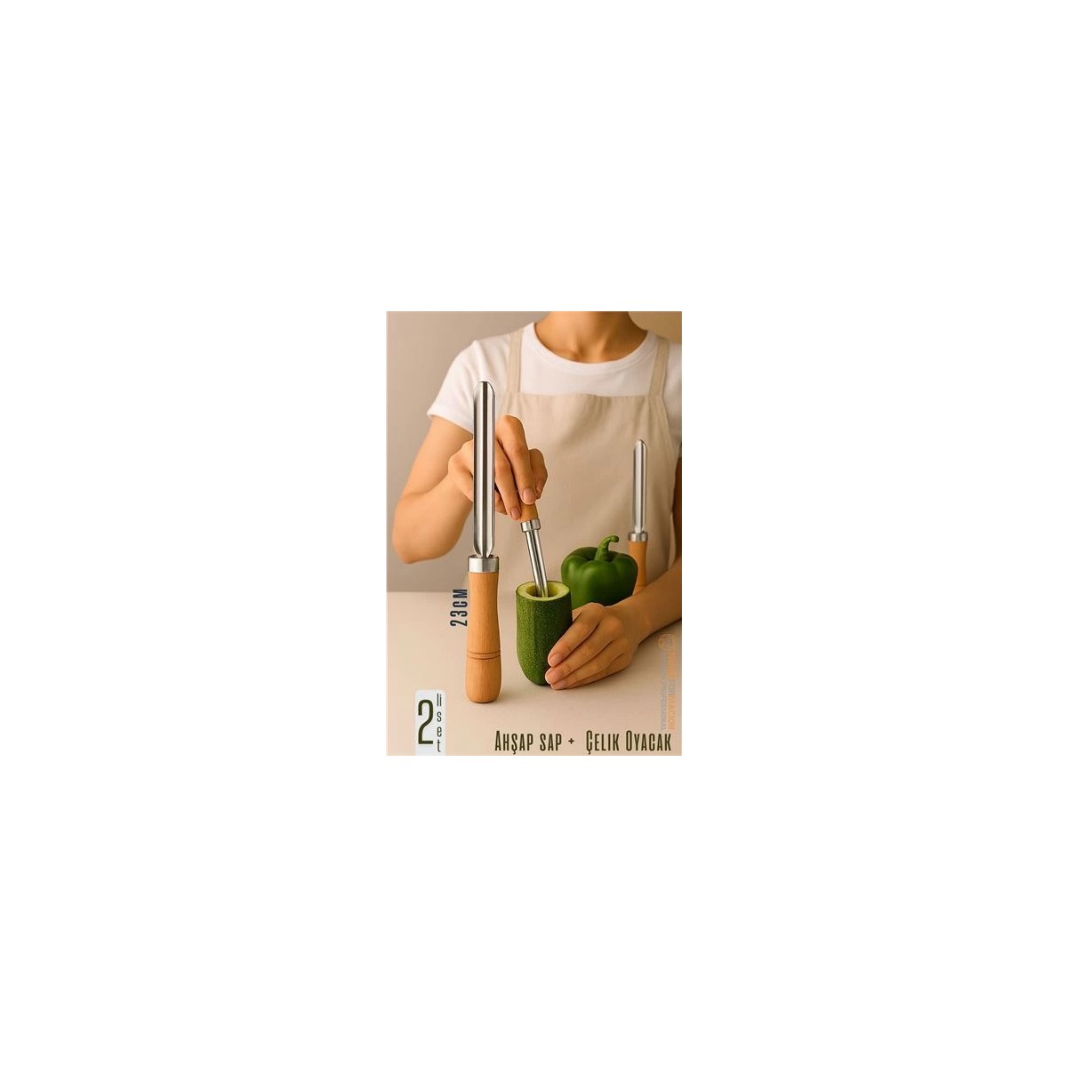 Dolmalık sebzelerin içini hızlı ve düzgün şekilde boşaltmak için tasarlanmış bu profesyonel oyacak, 304 kalite paslanmaz çelik ucu ve doğal ahşap sapıyla hem dayanıklı hem de ergonomiktir.