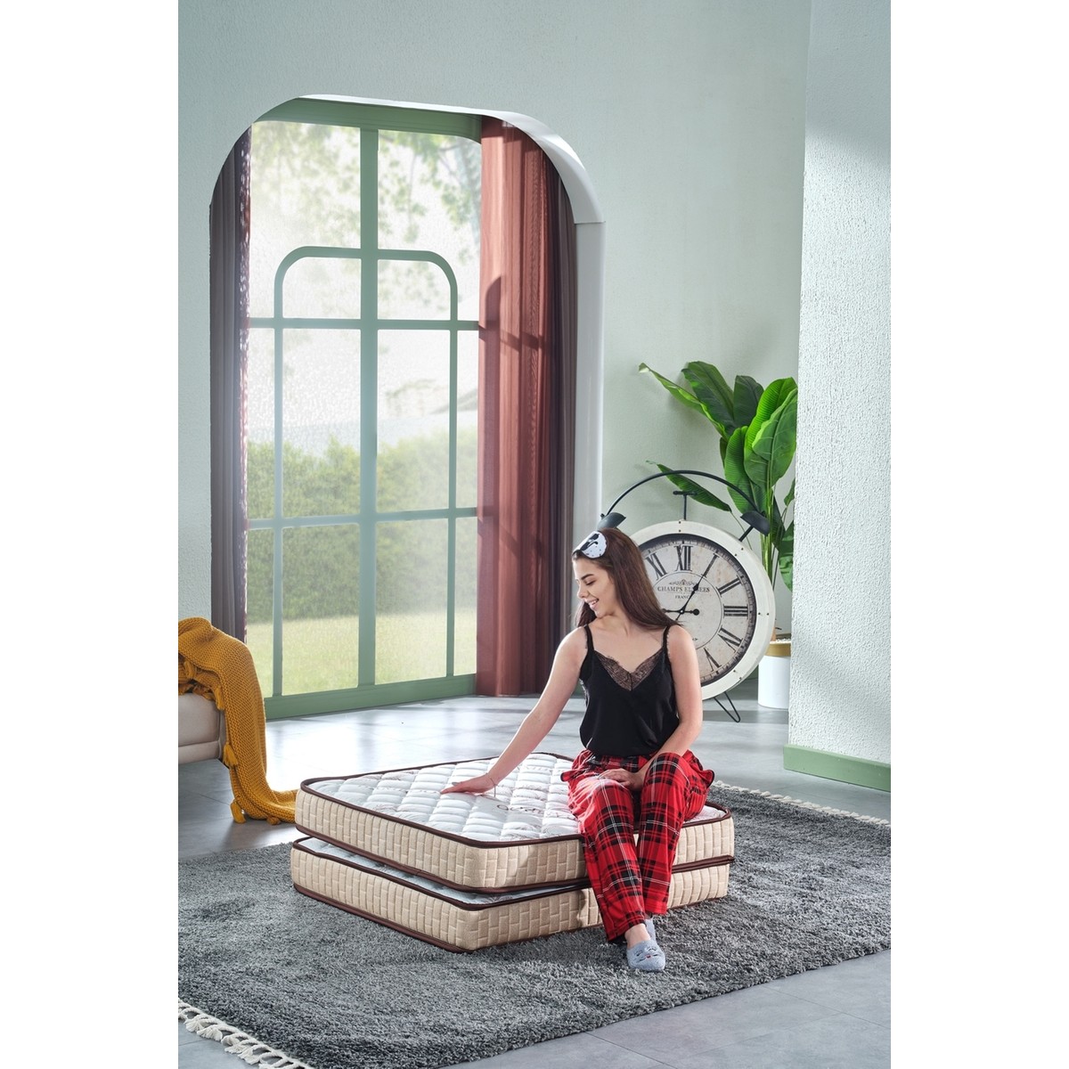 ● Yatağın yüzeyi yüksek çözgülü jakarlı kumaş katman ile yüksek yoğunlukta sünger, 150 gr/m2elyaf ve taşıyıcı tela ile kapitone yapılarak vücut temasında yumuşak bir dokunuş sağlar, Yatak kenarlarında özel kenar kaplama şeritleri ve hava sirkülasyonu özellikli kumaş.