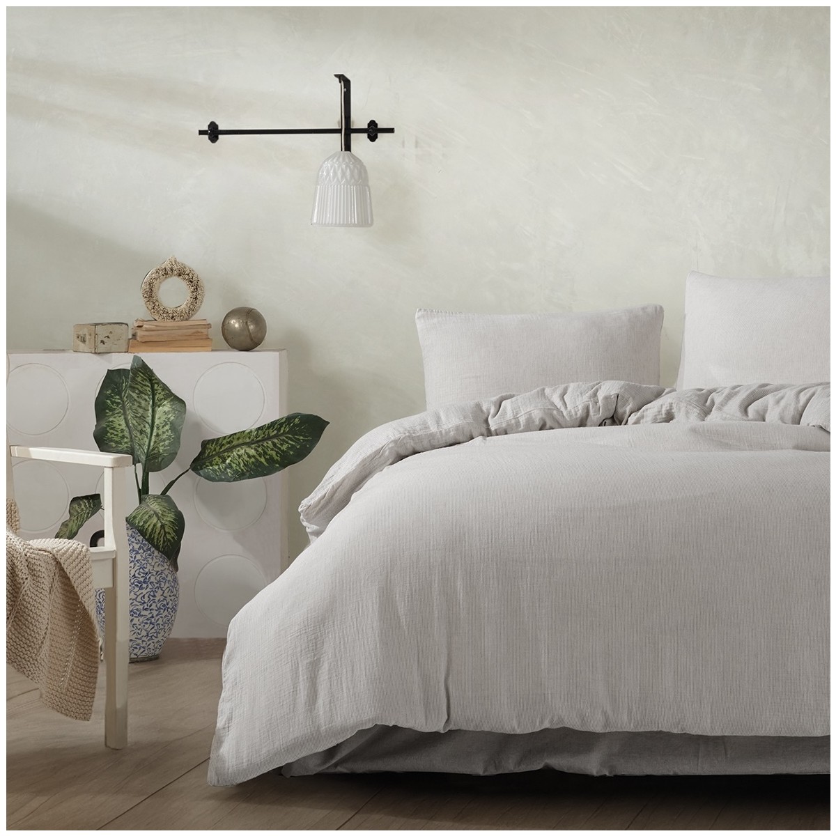 Ham ve boyalı 100% pamuklu compact penye ipliklerin birlikte dokunduğu 2 katlı müslin kumaştan üretilmiştir.;Doğal, nefes alır ve yumuşak yapısıyla konforlu bir uyku deneyimi sağlar.;Çamaşır makinasında 30°’de narin yıkama programında ya da elde yıkanabilir.;Takım içeriği – Nevresim 200×220 cm / Çarşaf 240×260 cm / Yastık Kılıfı 50×70 cm (2).;100% Pamukludur.