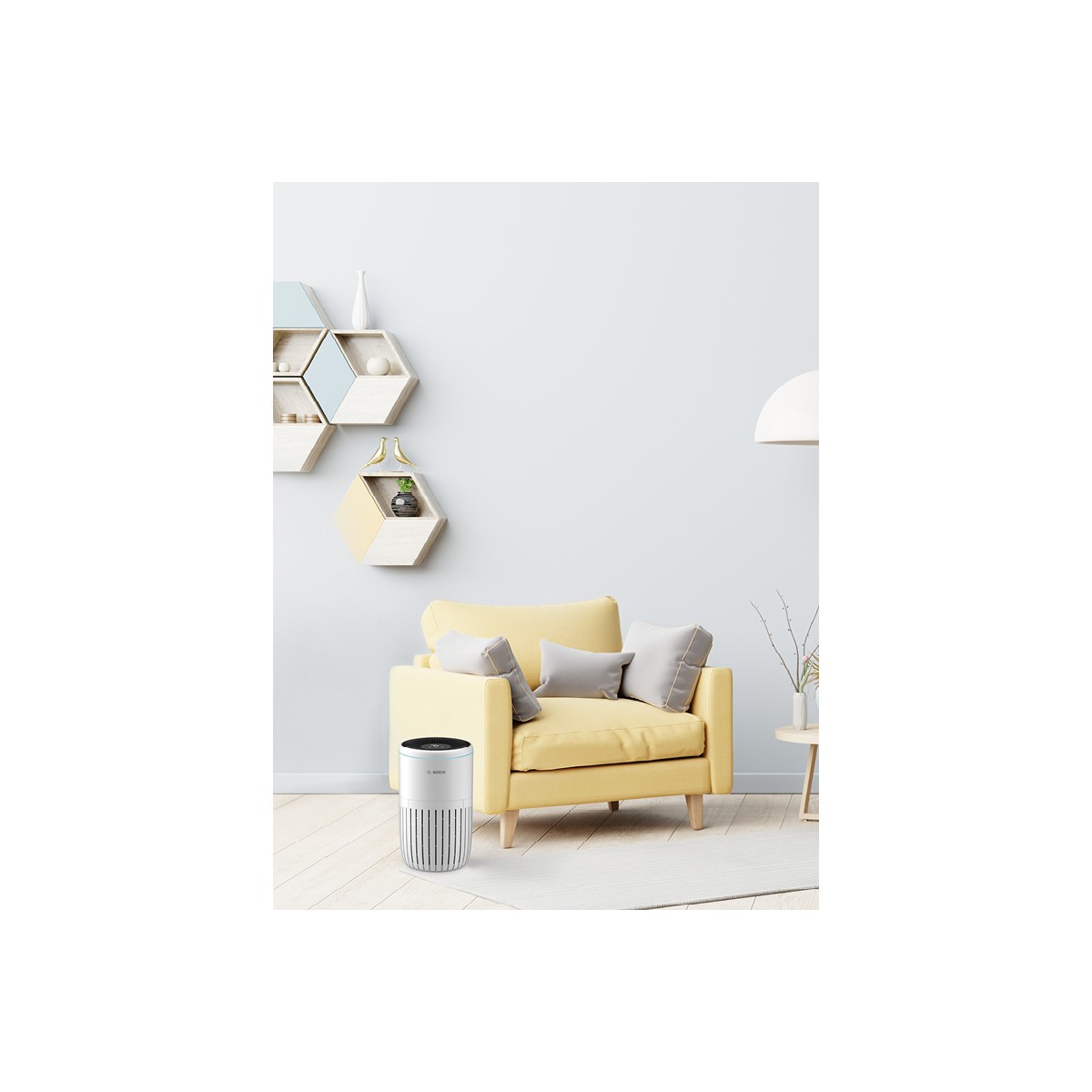 Ortamdaki havayı dert etmeyin ve sadece keyfini Bosch Air 4000 hava temizleyici siz ve aileniz için gerekeni yapar.;Bosch Air 4000 hava temizleyiciler bulunduğu her ortamda hava kalitesini otomatik algılar.;Ön filtre, aktif karbon filtre ve HEPA filtreden oluşan 3 katmanlı filtre teknolojisi sayesinde havadaki tüm kirlenmelerin %99.99’unu temizler.;Bosch Air 4000 hava temizleme cihazı, sürekli olarak optimum performans için filtreyi değiştirmenizi hatırlatan bir filtre değiştirme göstergesi ile donatılmıştır.;Mevcut hava kalitesi, LED ışık halkasındaki mavi, eflatun, turuncu, kırmızı renk kodları aracılığıyla sürekli olarak görüntülenir.;Air 4000 ayrıca kolay mod seçimi için 6 düğmeli bir LED dokunmatik ekrana sahiptir.;Bosch hava temizleyici ile etkileşim, sezgisel ve kendinden açıklayıcıdır.;-Otomatik modda hava temizleyicinin kapasitesi, akıllı sensörleri sayesinde sürekli olarak hava kalitesine ve oda boyutuna uyum sağlar.;Ayrıca çocuk kilidini etkinleştirebilir ve Air 4000’in belirli bir süre sonra kapanması için bir zamanlayıcı ayarlayabilirsiniz.;Bu fonksiyonlar, basitçe herhangi bir ayar yapmanıza gerek kalmadan konforu garanti eder.;-Sessiz modda, hava temizleyicinin ses basıncı seviyesi 25 dB’ye düşürülür, Air 4000 sadece fısıldar.;Ayrıca, siz ve aileniz rahatsız edilmeden uyuyun diye LED ışıklar ve ekran kapatılır.;Bosch Air 4000, 300 m³/saat temiz hava kapasitesi ile 62,5 m²’ye kadar olan odalarda kullanıma uygundur.;Kompakt boyutları sayesinde hava temizleyici, ya olduğu yerde kullanılabilir ya da bir odadan diğerine kolayca taşınabilir.;Şık ve ergonomik tasarımı sayesinde ihtiyaç duyulan her yerde kullanabilirsiniz.;*Air 4000, yapılan testler sonucu antibakteriyel (bakterisidal) ve antiviral (virüsidal) etkinlik sağlamıştır.;* Serratia marcescens, B.;Subtilis ve Staphylococcus albus bakterilerine karşı 30m³ hacimde 1 saatte %99.99 oranında etkinlik sağladığı test edilmiştir.;* Bacteriophage MS2, Adeno Tip 5 ve Vaccinia virüslerine karşı 30m³ hacimde 1 saatte %99,99 oranında etkinlik sağladığı test edilmiştir.;Polen, evcil hayvan tüyü, toz, virüs ve koku gibi tüm kirleticilerin %99.99’unu havadan temizler.;62,5 m² büyüklüğüne kadar olan odalarda havayı filtreler;300 m³/h temiz hava kapasitesine (CADR) sahiptir.;Otomatik/sessiz mod, akıllı sensörler ve hava kalitesini gösteren bir LED ışık halkası içerir;Air 4000 mükemmel hava temizleme için ön filtre, aktif karbon filtre ve HEPA filtreye sahiptir.