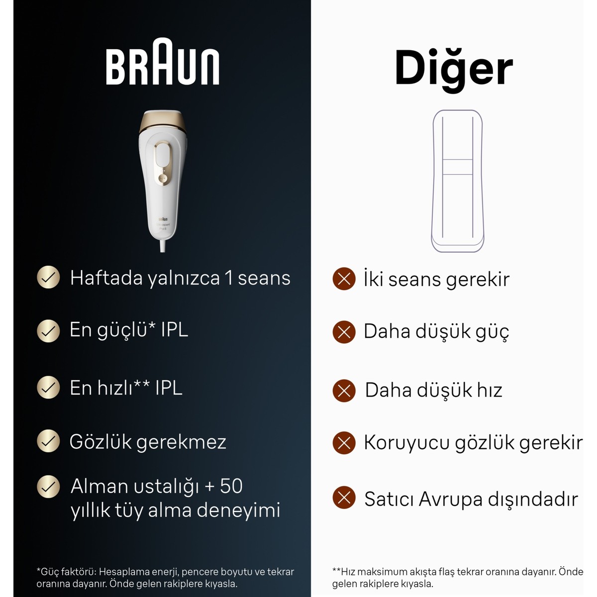 Braun’un en iyi IPL’idir. Bu bir lazerli tüy alma cihazı değildir, sadece 4 haftada gözle görülür tüy azaltma ile size evinizden çıkmadan 6 aya kadar pürüzsüz bir cilt sağlamak için gelişmiş IPL teknolojisi kullanan bir üründür (12 haftalık bakımdan sonra tüylerde %74 azalma – bikini, bacak, koltuk altı için ortalama değer. Bireysel sonuçlar değişebilir).