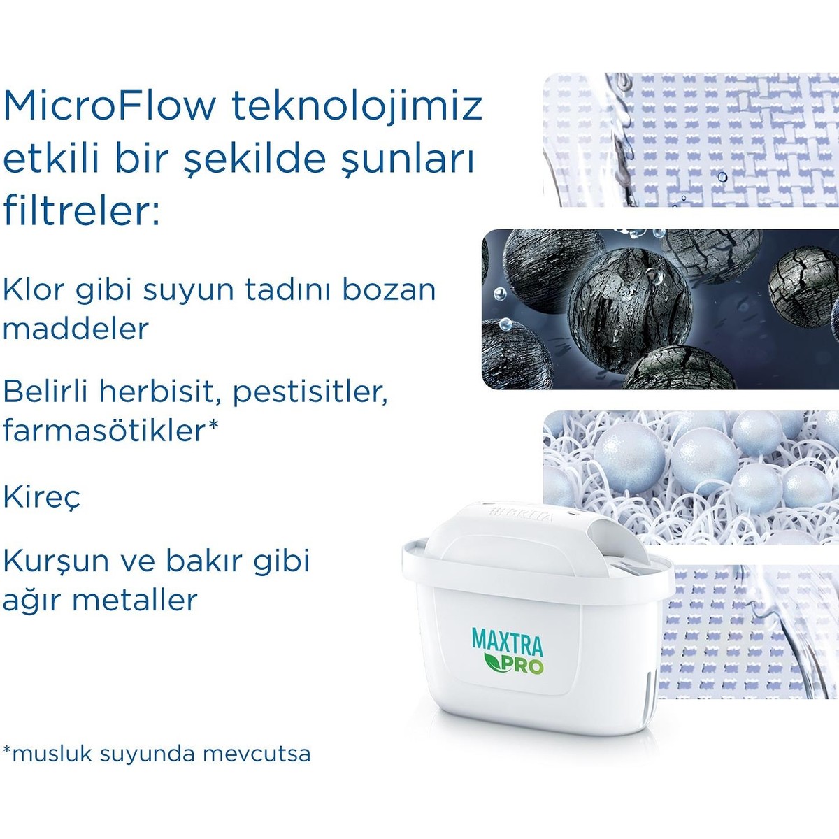 Bütün BRITA filtreli sürahi modelleriyle uyumlu olan yenilikçi MAXTRA PRO su filtresi, MicroFlow teknolojisi sayesinde musluk suyunu 4 aşamada filtreler: