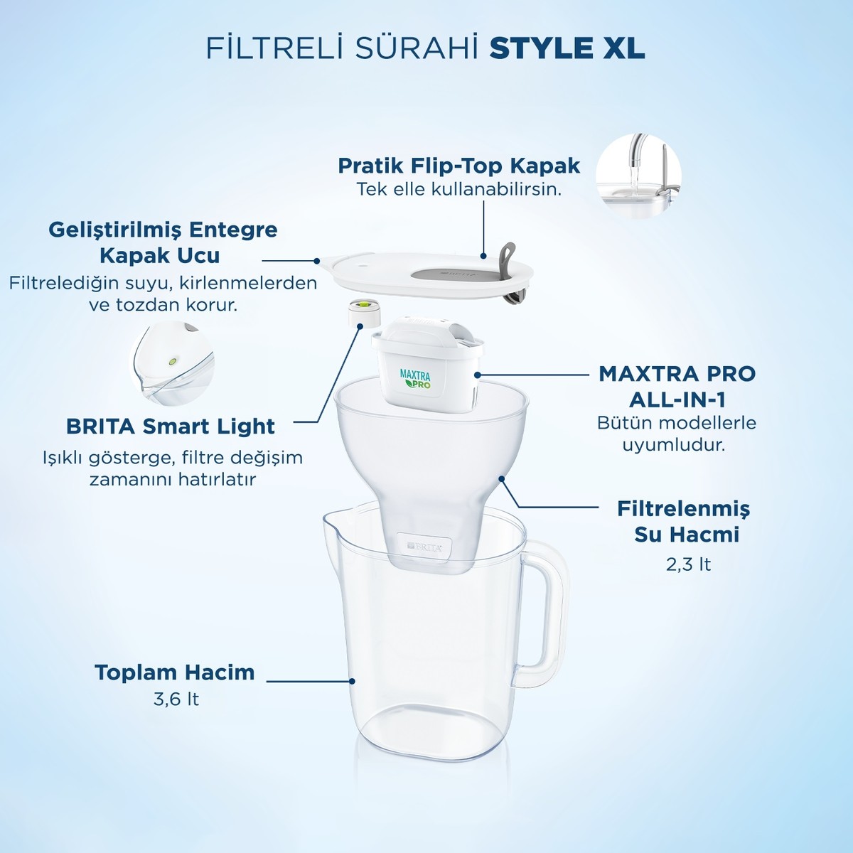 *Kutu içerisinde 1 adet MAXTRA PRO ALL-IN-1 su filtresi ve 1 adet BRITA Style XL Filtreli Su Arıtma Sürahisi – Gri bulunmaktadır.