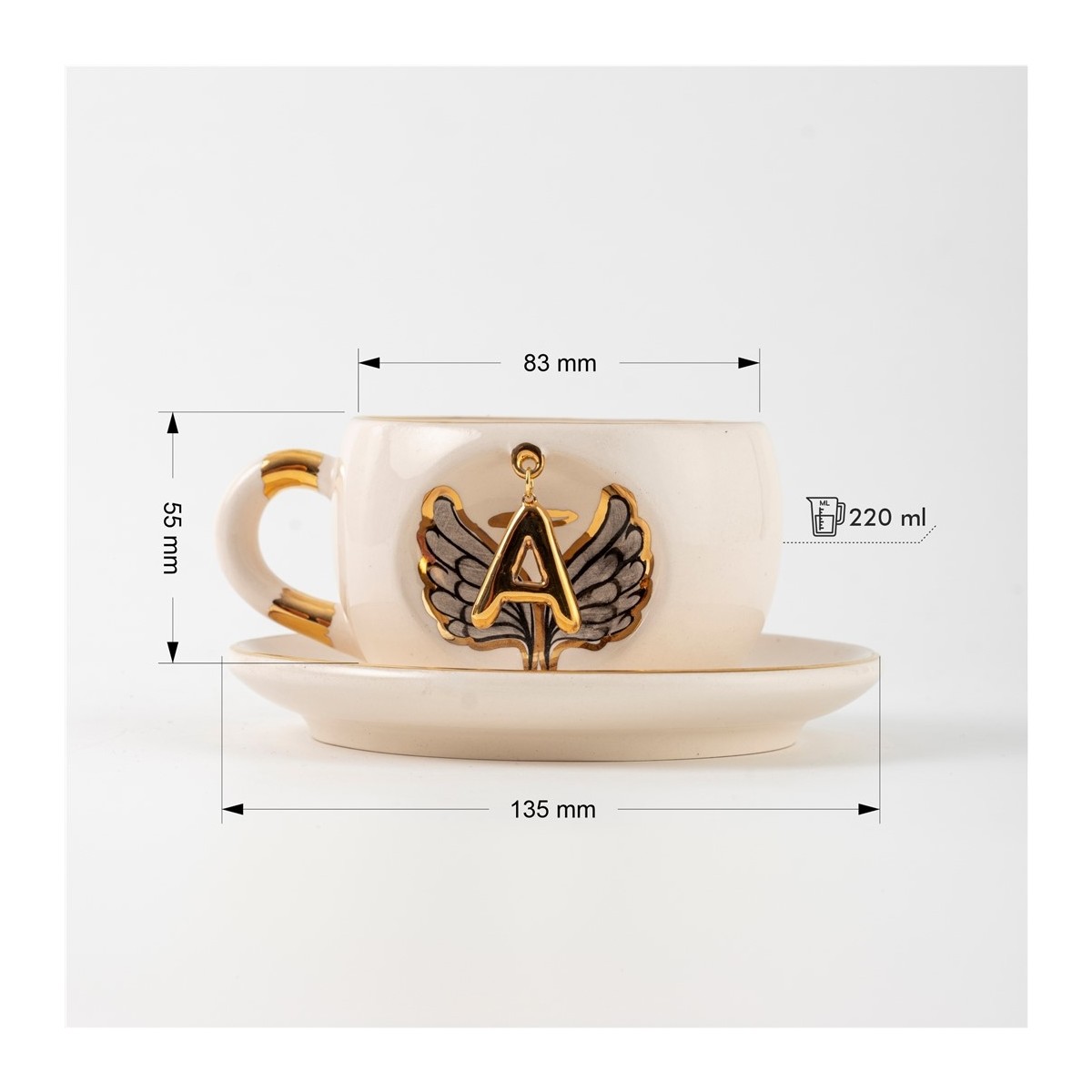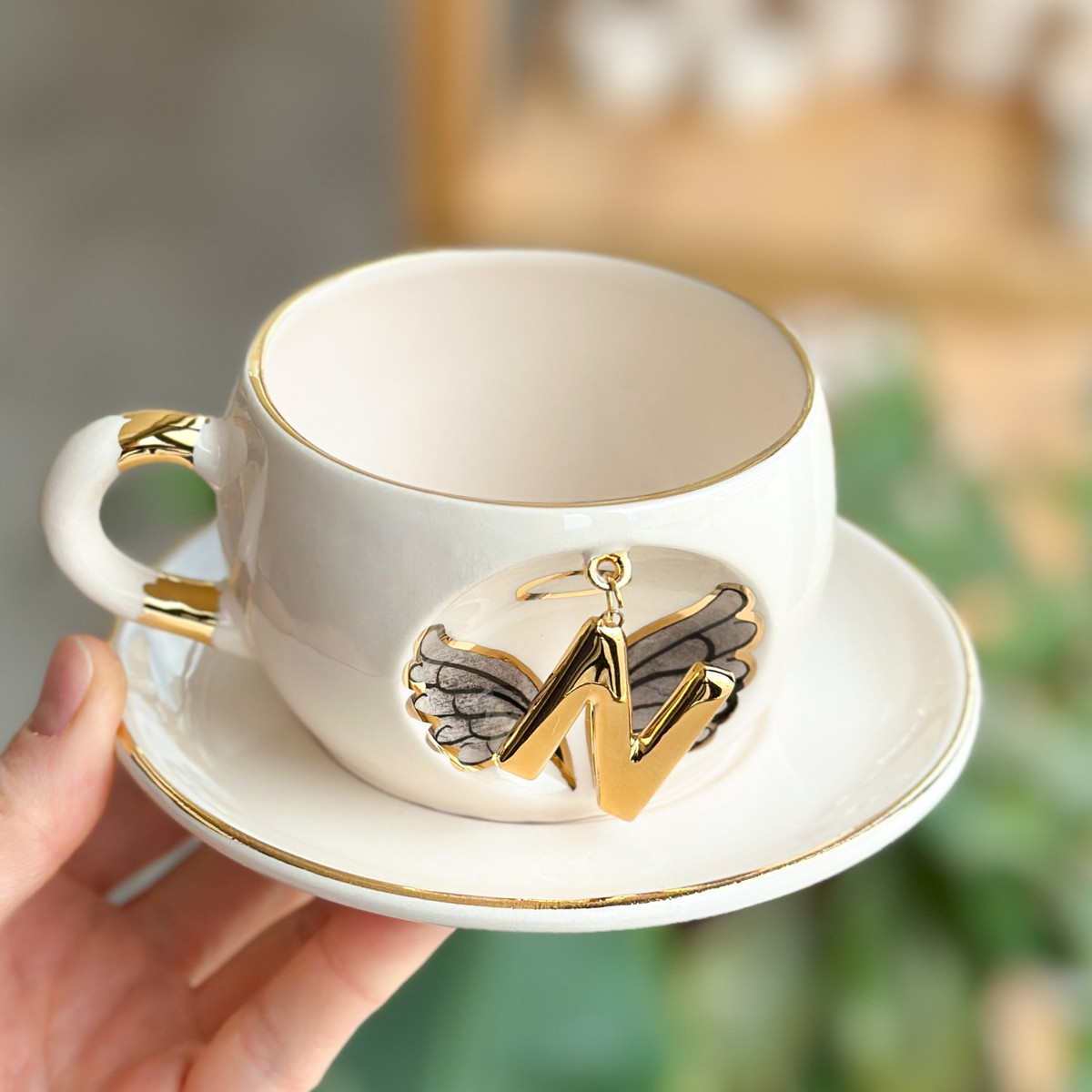 Fincan Üzerindeki Oyukta Melek Kanadı Motifi Ve Sabit Halkaya Takılı Seramik Harf İçerir.