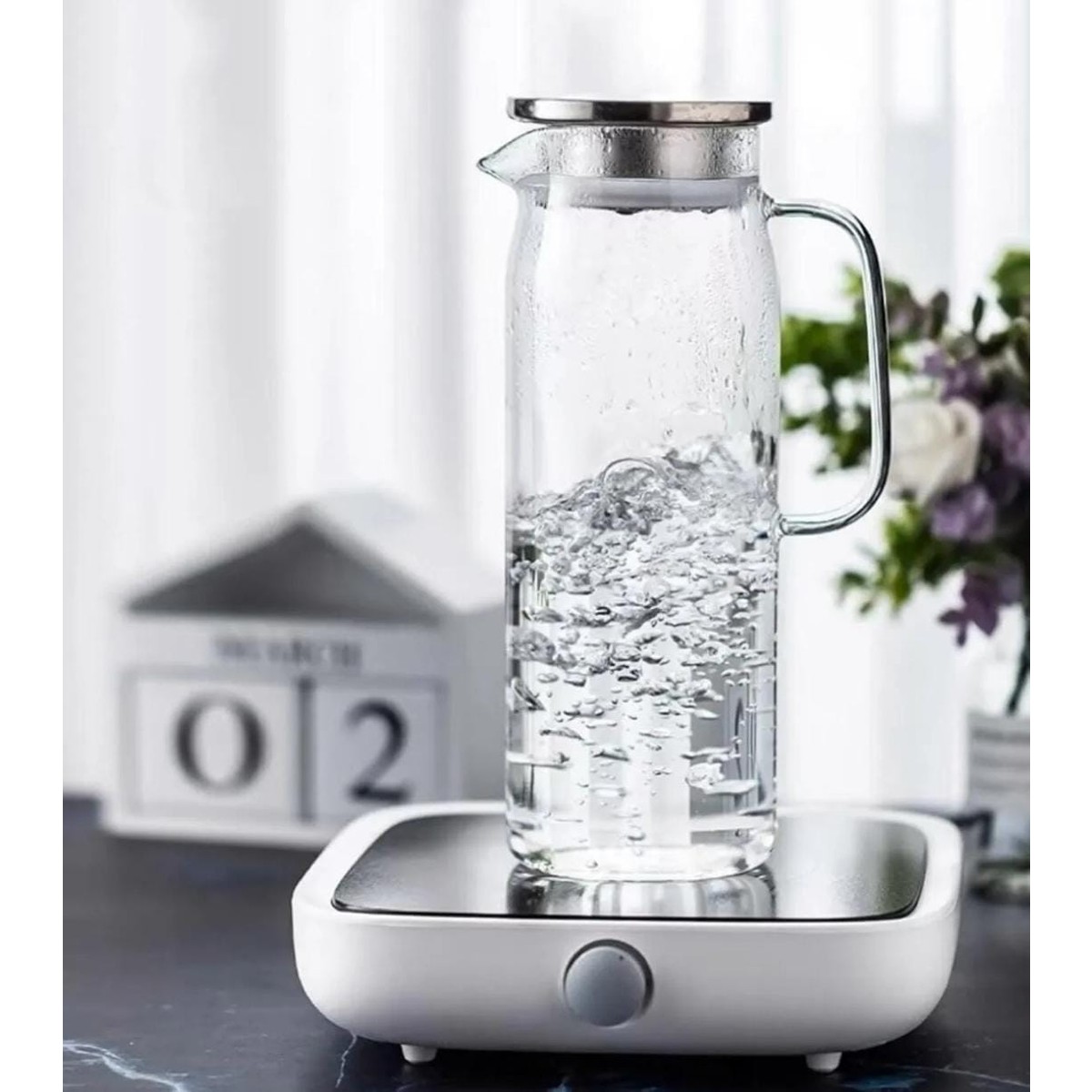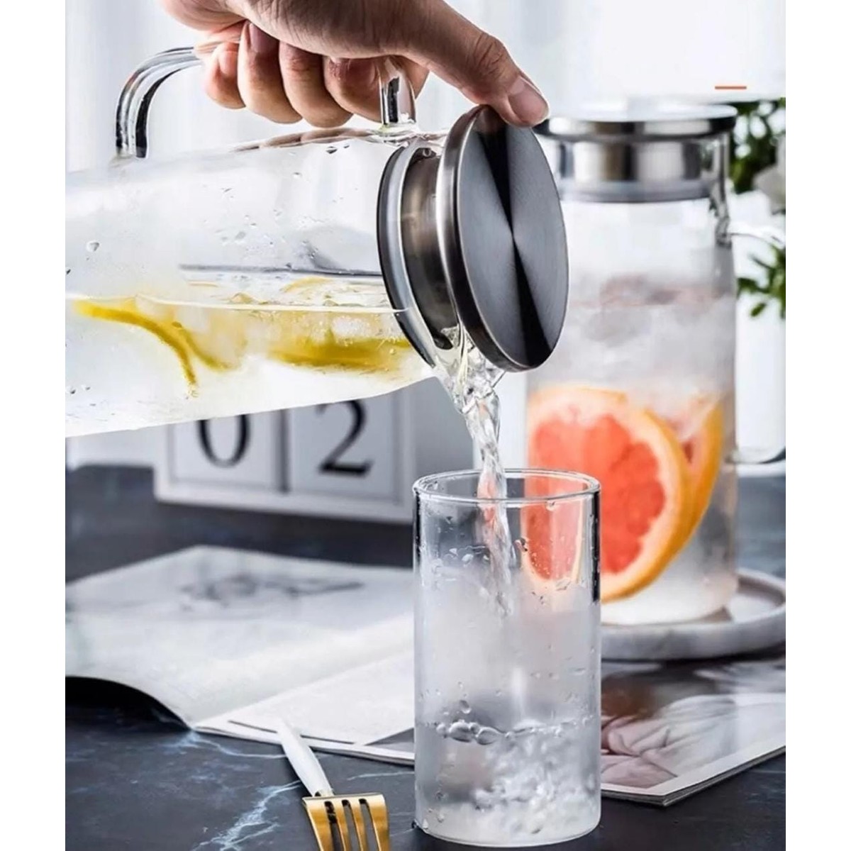 Metal kapak anlatıldığı gibi süzgeçli cam sürahi şık ancak sapı kütlesine göre büyük