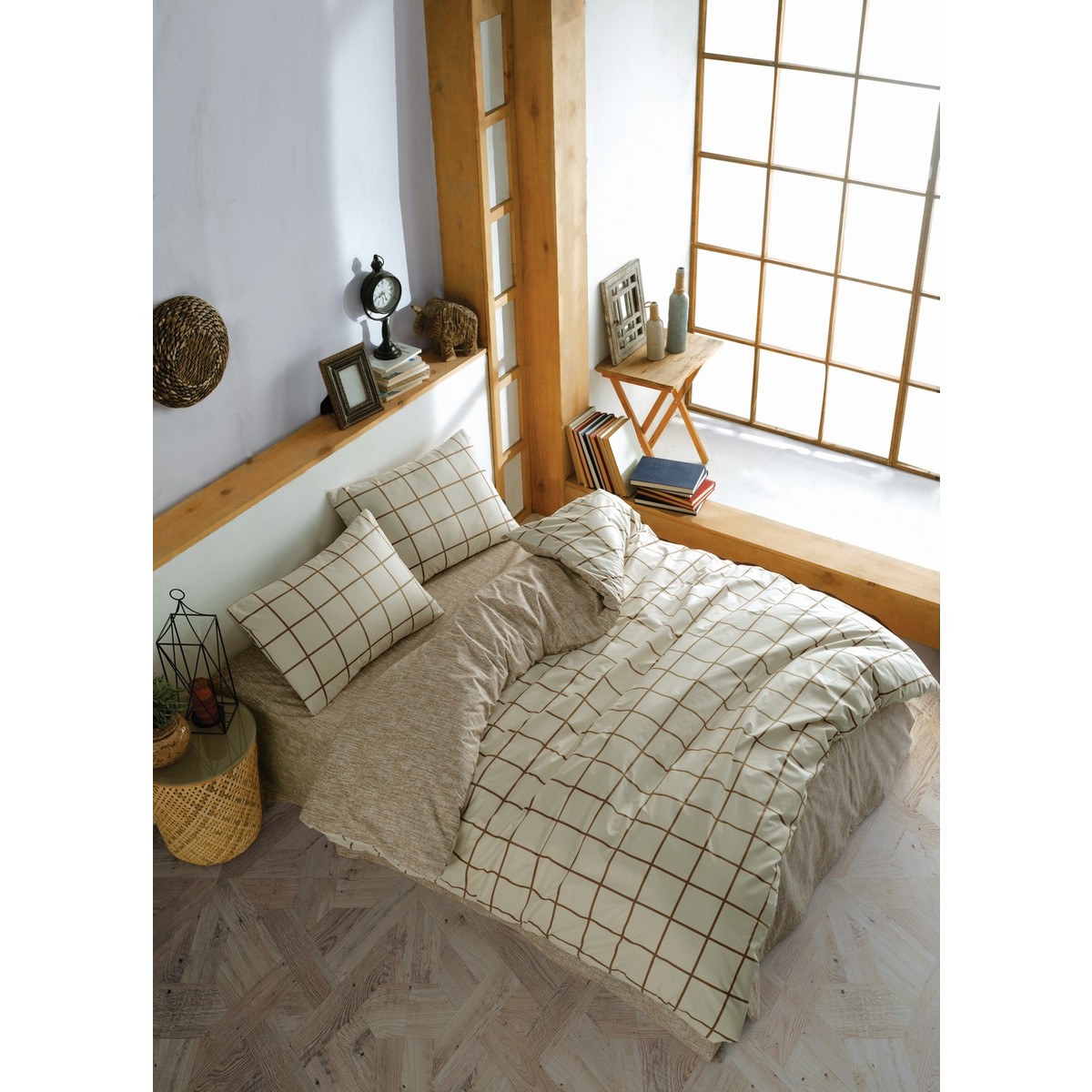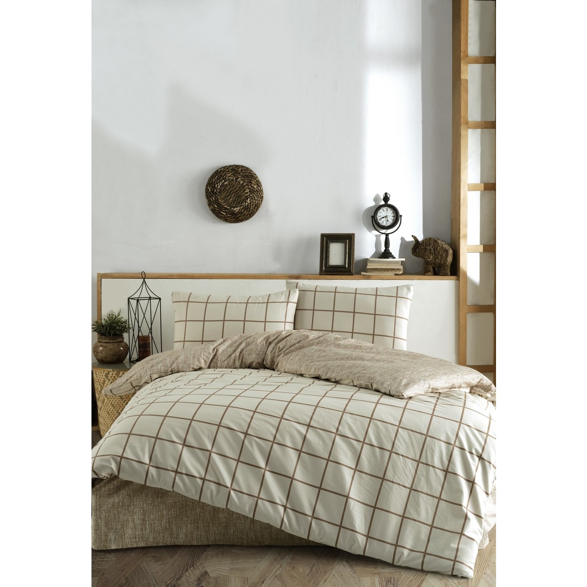Casa Carina Kare Krem Rengi Ranforce Lastikli Çarşaflı Çift Kişilik Nevresim Takımı