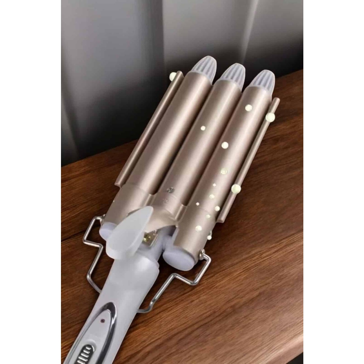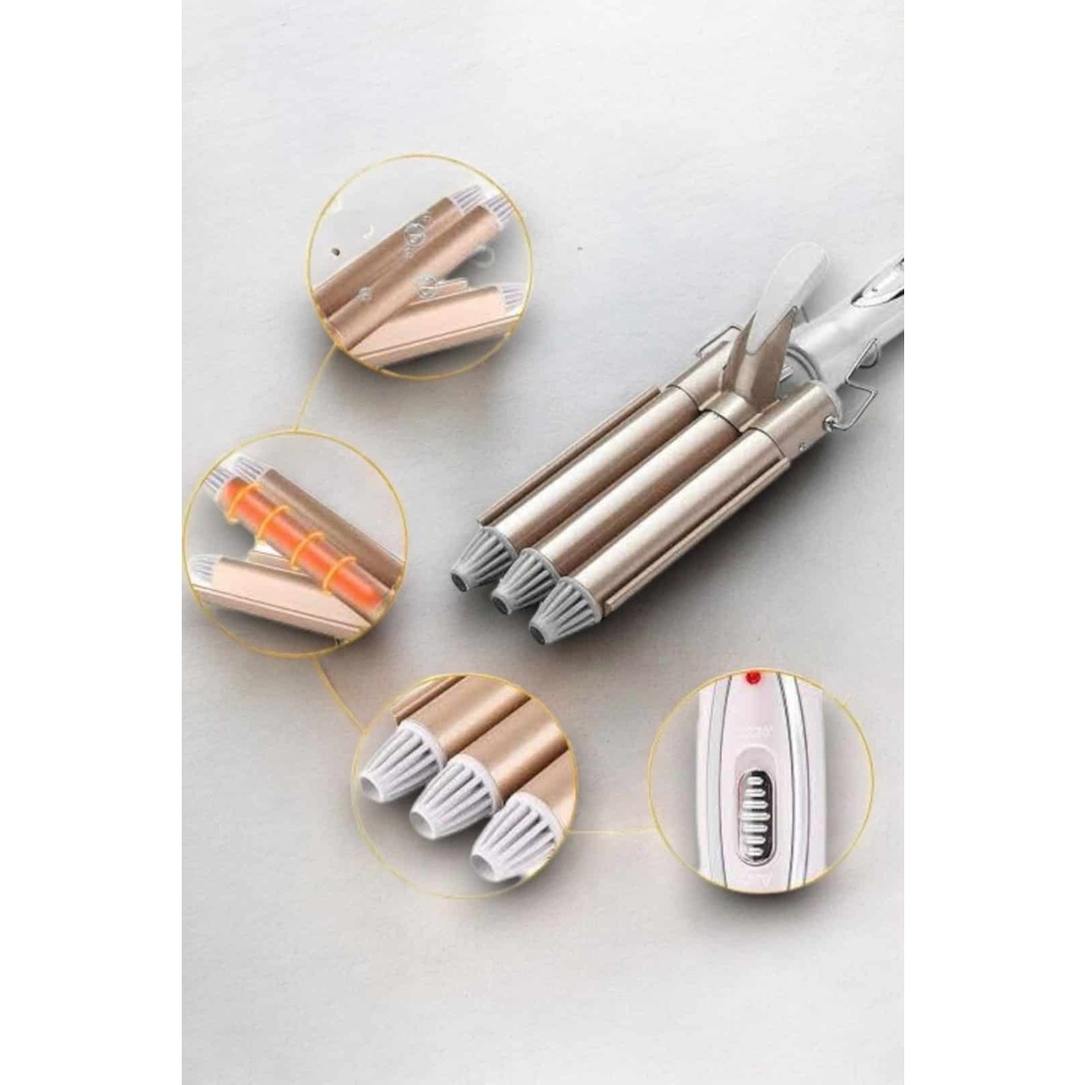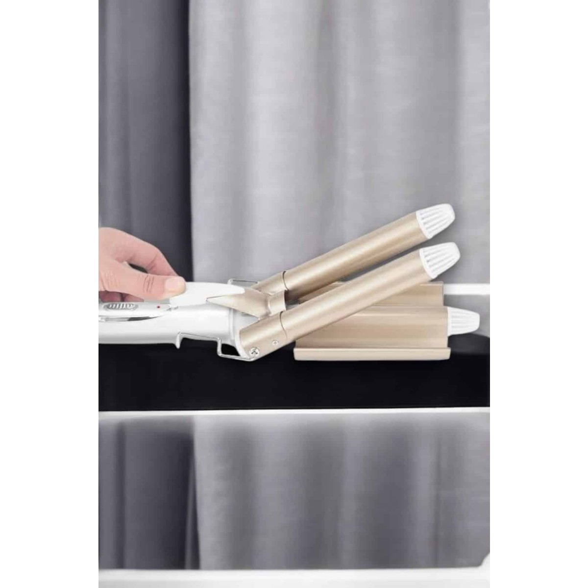 Seramik kaplama teknolojisiyle üretilen bu saç maşası, saçınıza zarar vermeden profesyonel sonuçlar elde etmenize yardımcı olur. Negatif iyon salınımı sayesinde saçtaki elektriklenmeyi azaltır ve doğal parlaklığı korur. 25 mm çapında üç namlulu tasarımı, orta ve uzun saçlarda hacimli ve kalıcı bukleler oluşturur. Hızlı ısınan PTC ısıtma sistemi, 30 saniye içinde 170°C’ye ulaşarak zamandan tasarruf etmenizi sağlar. Ayrıca 220°C’ye kadar ayarlanabilir sıcaklık kontrolü, farklı saç tipleri ve şekillendirme ihtiyaçlarına uygunluk sunar. Kaymaz tutamaç, ısı yalıtımlı ön braket ve haşlanma önleyici üst tasarımıyla güvenli ve pratik bir kullanım deneyimi sağlar. Altın rengi modern tasarımı ile şıklık ve işlevselliği bir arada sunar.