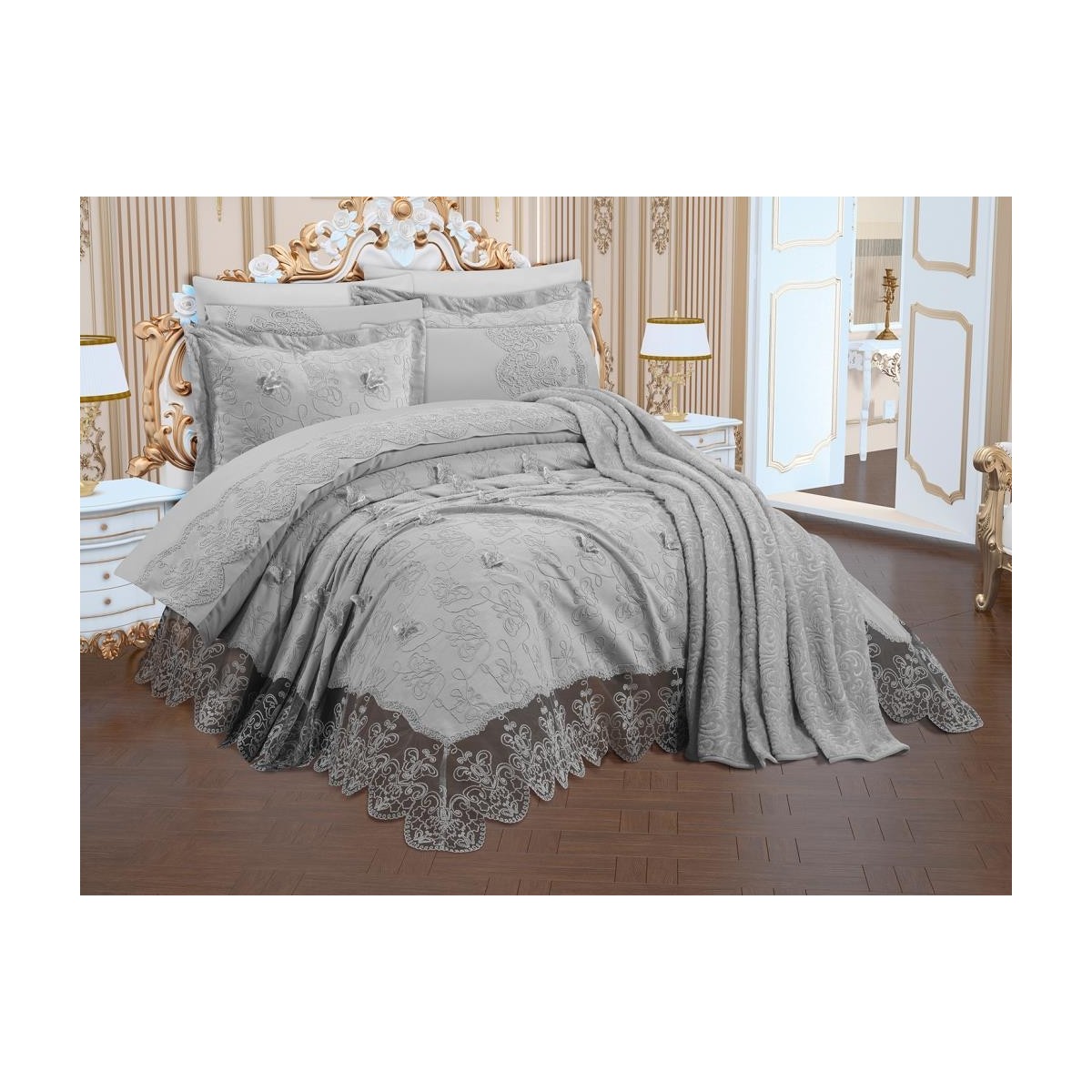 Çeyiz Diyarı Fethiye Şönil Nakışlı 10 Parça Gelin Seti Gri