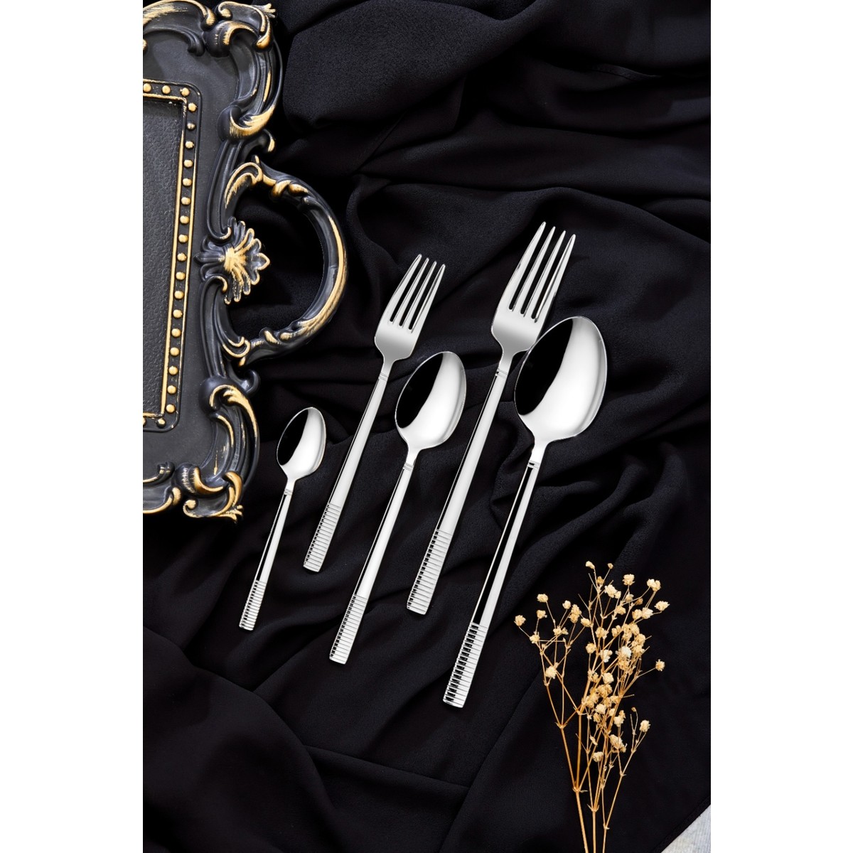 Bu çeyiz seti, sadece bir yemek takımı değil, aynı zamanda sofralarınızda bir sanat eseri gibi yer alacak. Çeliğin soğuk ve sofistike dokunuşu, yemeklerinizi daha da özel hissettirecek. Her bir kaşık, çatal ve bıçak, elinize mükemmel oturacak şekilde tasarlanmıştır, böylece yemek yemenin keyfini tam anlamıyla çıkarabilirsiniz.