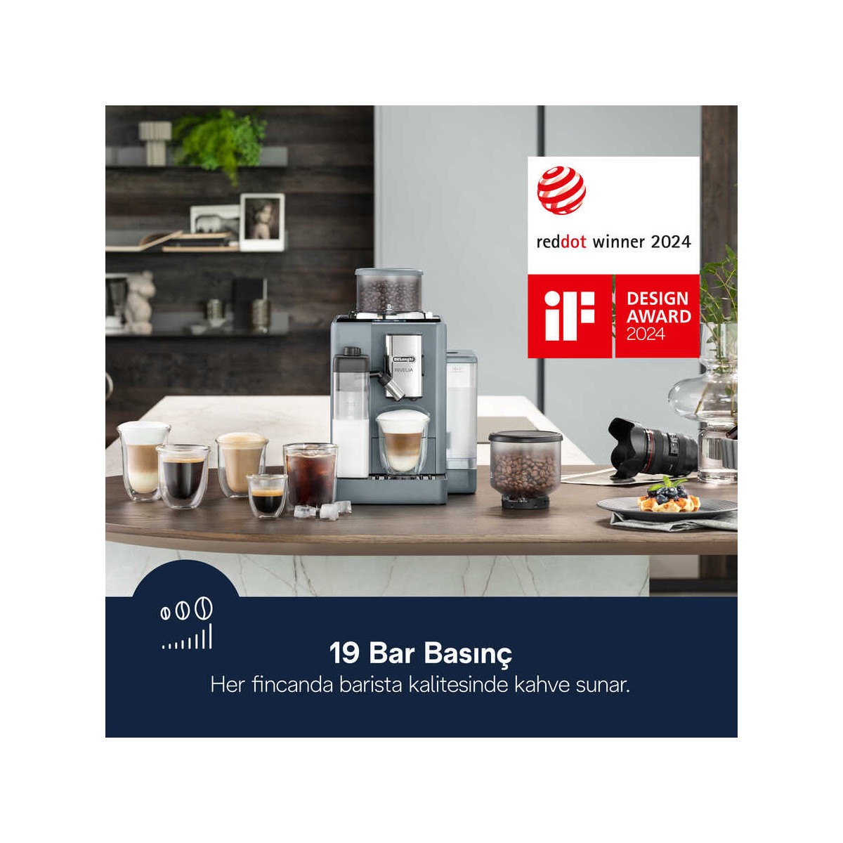 Delonghi Rivelia Serisi EXAM440.55.G Tam Otomatik Kahve Makinesi 2 farklı Çekirdek Değiştirme Haznesi, farklı çekirdek çeşitlerini zahmetsizce değiştirmenizi ve keşfetmenizi sağlar, 16 adet tek dokunuşlu içeceğe sahip sezgisel 3,5“” renkli ekran, LatteCrema Hot, tek dokunuşla otomatik temizleme ile otomatik olarak ince, zengin bir sıcak süt köpüğü sağlar, Yumuşak açılara sahip şık ve kompakt tasarım. Taze Çekilmiş Kahve Makineniz, her fincan için en iyi lezzeti sunmak üzere çekirdekleri demlemeden hemen önce taze olarak öğütür. Bu sayede, kahvenin aroması ve tüm nüansları korunarak, her seferinde mükemmel bir kahve Tek Dokunuşla Sevdiğiniz Lezzetler Sezgisel tek dokunuşlu kaydırmalı ekran ile en sevdiğiniz içecekleri seçmek ve hazırlamak artık çok kolay. Sadece ekranda istediğiniz içeceğe dokunun ve gerisini makineniz halletsin. LatteCrema Hot Teknolojisi LatteCrema Hot Teknolojisi ile her fincanda mükemmel köpüklü latte ve cappuccino içimine hazır olun. 16 Farklı Lezzetle Keyifli Anlar Geniş içecek yelpazemiz ile her zevke hitap eden bir lezzet bulabilirsiniz. 16 farklı içecek seçeneği arasında gezinerek Espresso, Americano, Cappuccino, Flat White gibi klasik favorilerinizin yanı sıra daha az bilinen lezzetleri de keşfedebilirsiniz. Rivelia ile kendinizi kahve dünyasına bırakın. Çekirdek Değiştirme Sistemi ile farklı tatlardaki çekirdek çeşitlerini keşfedin, zengin animasyonlar ve size özel kahve rutinleri ile 3,5 “tam dokunmatik renkli ekranla sürükleyici bir deneyimin tadını çıkarın. Tarzınıza uyan kompakt bir makinede LatteCrema Hot Teknolojisini kullanarak süt bazlı içeceklerinizi ince ve zengin köpükle doldurun.” • Soğuk Kahve içecekleri; Soğuk Americano / Soğuk Kahve / Soğuk Espresso • Sıcak Kahve içecekleri; Espresso / Espresso Lungo / Kahve / Uzun / Americano • Sıcak sütlü içecekler; Cappuccino / Latte Macchiato / Cappuccino Karışımı / Sıcak Süt / Caffelatte / Düz Beyaz / Cortado / Espresso Macchiato • Aroma Fonksiyonu: Evet • Kahve Miktarı Özelleştirme İmkanı: Evet • Gelişmiş Kişiselleştirme: 4 kullanıcı profili • Kontrol Tipi: Dokunmatik Ekran • Ekran: 3,5″ TFT Renkli Ekran • Süt Sistemi: LatteCrema Teknolojisi • İkiz Atış: Evet • Su filtresi kullanma imkanı: Evet • Programlanabilir su sertliği: Evet • Çekilmiş kahve kullanma imkanı: Evet